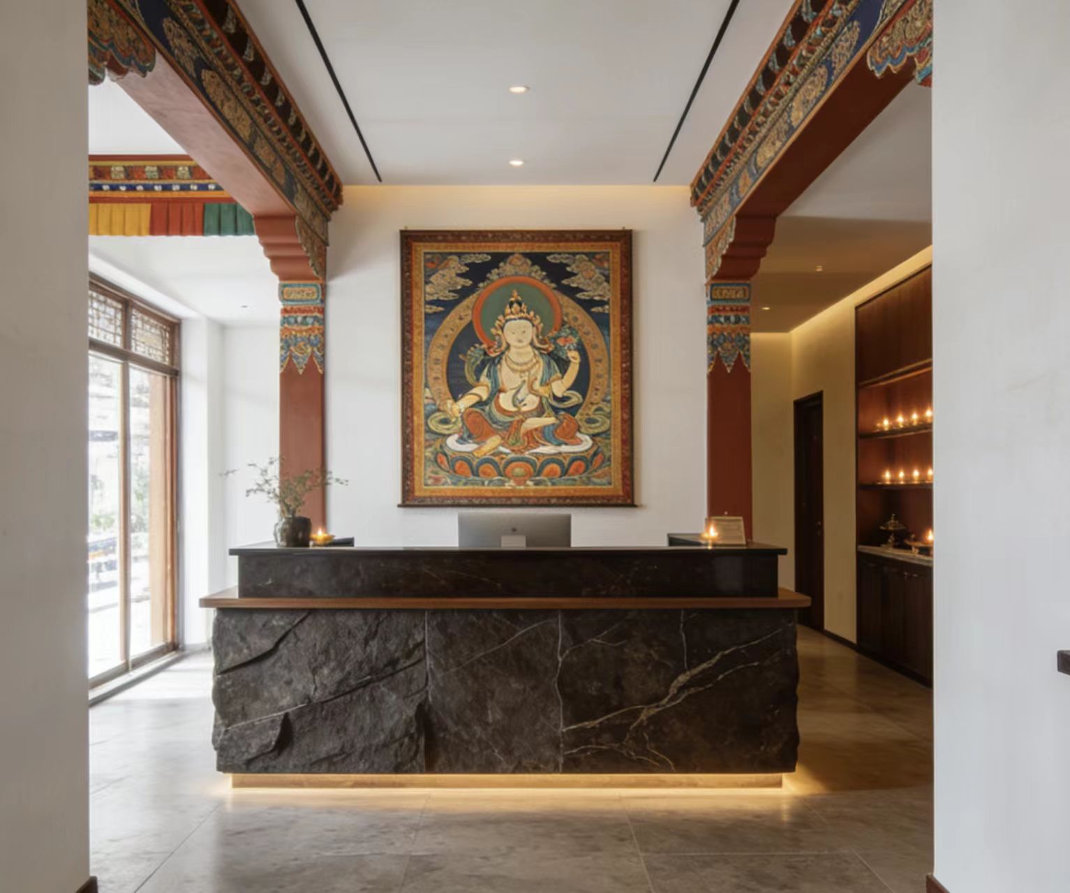 设计以“藏韵留白,简约栖居”为核心,在保留藏式文化底蕴的基础上,摒弃繁复装饰,适配现代民宿的舒适需求与审美趋势。设计弱化传统藏式元素的堆砌感,剔除经幡等过于浓烈的符号化装饰,通过材质、色彩与线条的精准把控,将藏式的质朴肌理与现代简约的留白美学相融合,打造出兼具文化辨识度与居住舒适度的私密空间,让宾客在静谧中感受藏式风情的内敛韵味。
