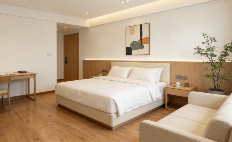 本次设计聚焦民宿大床房核心空间,以功能分区清晰、动线流畅为原则,构建“休憩+休闲”双核心场景。空间主体为大床房区域,选用尺寸适宜的实木大床作为视觉与功能核心,床头贴合墙面布置,保障休憩区域的私密性与规整感。床侧预留充足活动空间,增设休闲组合区,搭配黑色皮质沙发与简约茶几,形成独立的放松角落,满足宾客阅读、品茶等轻社交需求,兼顾实用性与空间层次感。整体布局摒弃冗余陈设,保持空间通透,无多余杂物堆砌,契合简约设计诉求。