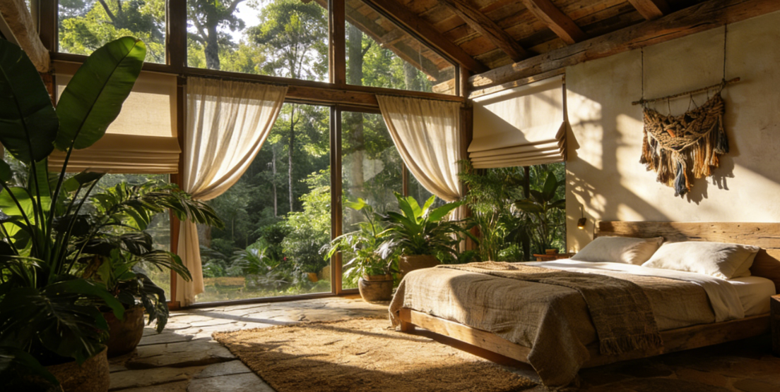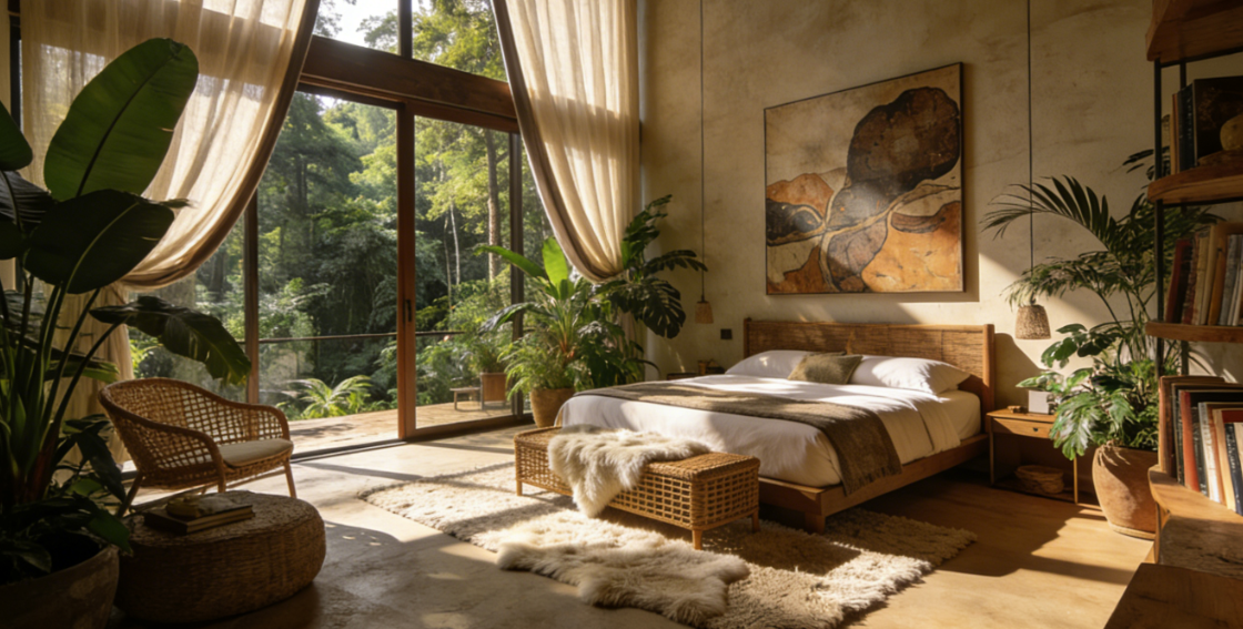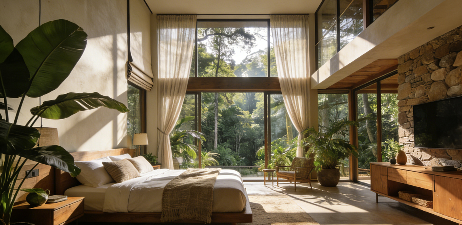 空间与自然的无界融合是设计的首要亮点。挑高的户型格局打破了室内空间的压抑感,搭配整面通透的落地窗,将窗外连绵的森林景观毫无保留地引入室内,形成“推窗见林”的视觉延伸。设计师特意在窗侧设置了可折叠收纳的纱帘,垂落时可柔化强烈的自然光影,营造朦胧静谧的氛围;收纳于两侧时则不遮挡观景视野,让自然与室内空间完全交融,实现了“身居室内,心在荒野”的居住体验。