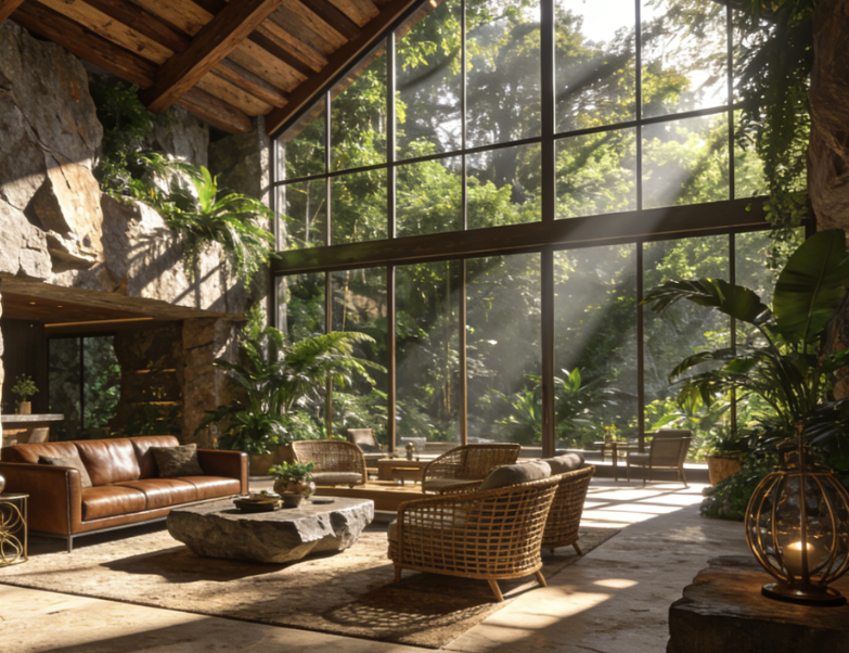 质感与氛围的精准拿捏是设计的另一核心亮点。室内以自然肌理为基底,岩石元素的巧妙运用呼应野奢主题,搭配错落有致的原生绿植,让空间自带自然气息;地面铺设的质感地毯,不仅中和了岩石的冷硬,更提升了空间的温暖触感与奢华感。同时,设计师深谙光影的叙事力量,借助落地窗引入的自然天光,与室内材质相互映衬,光线流转间,纱帘的轻柔、岩石的厚重、绿植的鲜活交织成景,让空间兼具野性张力与温柔质感。
