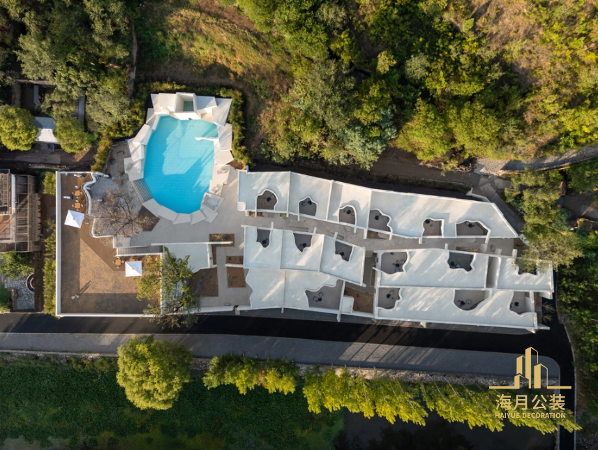建筑在初次到达时已经基本完成,业主的愿望是将其打造成一家高端度假型民宿。在我们开始对这个项目进行全面改造之前,我们首先在原有建筑的基础上感受了整个场地。场地原建筑以聚落形态沿着山径和溪谷呈条带状分布在山体之中,其中临溪部分单体建筑框架和泳池基本完成,建筑以红墙青瓦为主要特点。此外,场地中还有四个组团...