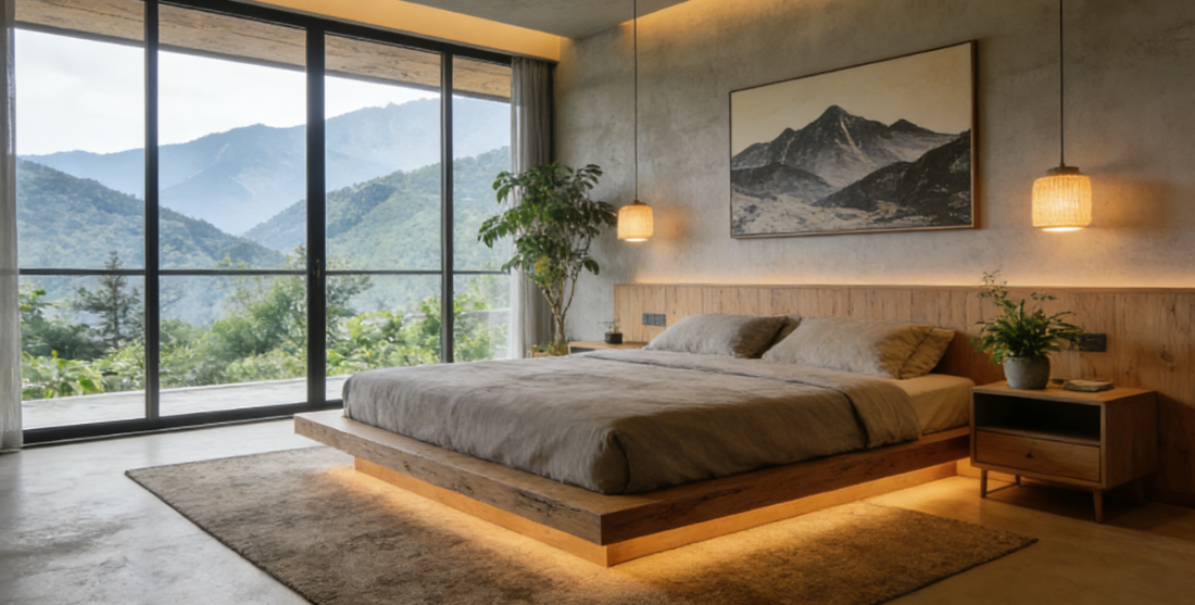 灯光设计注重层次感,床头设置可调节亮度的壁灯,满足睡前阅读需求;顶面嵌入式射灯提供基础照明,搭配休闲角落地灯与衣柜感应灯带,营造温馨且富有氛围感的光影环境,避免灯光破坏山景的自然美感。