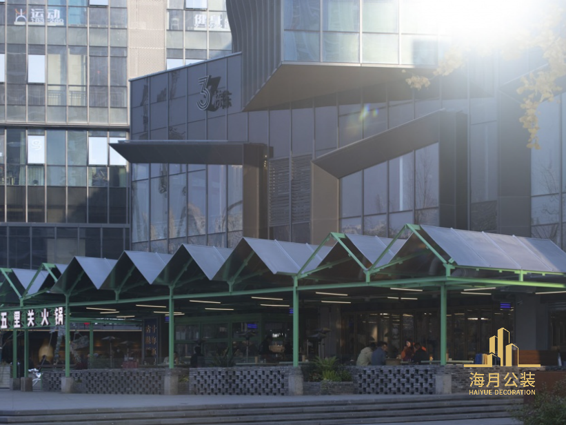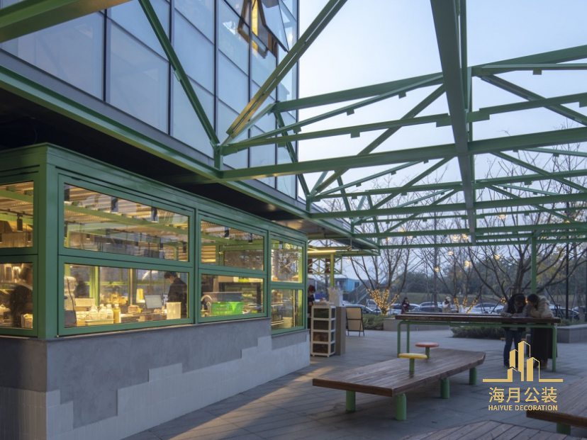 我们采用“搭棚棚的大排档”作为装修设计意向,想要以此唤起对市井氛围的场所记忆。小尺度连续折叠的三角形伞棚,与大体量堆叠的建筑体形成对话,体量和尺度的压缩,带来更近人的感受。室外构筑物分为有顶和无顶两部分空间。有顶空间立面开敞,夏冬两季增设临时塑料围挡作为气候分隔。无顶空间各面都开敞,是场所限定的框架构筑物,荷载设计上考虑了加建屋面板的余量,根据未来的发展可灵活搭设。采用型材搭接使得构筑具有“临时”物的气质,有顶和无顶的两组构筑物之间产生对话,给人架子还在搭建中的“未完成”印象,传达出市井中即兴、松弛的节奏。