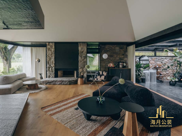 由于农场之家的私密性需要,我们后期在装修设计中的西侧草坪上增加了两道低矮的废墟石墙,隔开了酒店和家的户外场地。沿着草坪穿过石墙间的矮门,再往西便是农场之家的领地。对自然的体验还在延续变化,大草坪尽端是场地最大的水塘,水塘的对岸是精心打造的各色系观赏花园,沿着水塘边的林荫道走出去,身边便只有花园和远山了。这场在花园与山水之间的游走最终停留在农场深处无尽的自然之中。