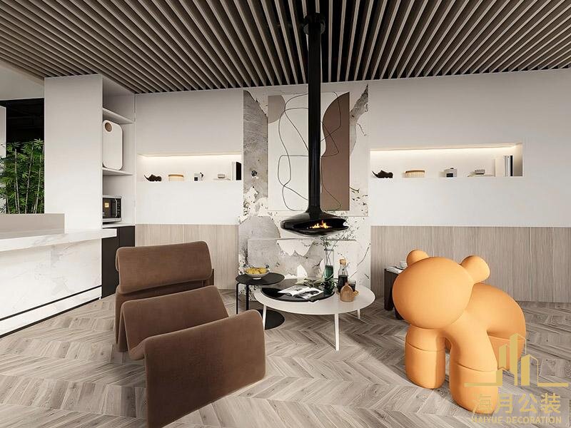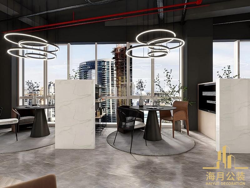 从空间规划到细节打磨,海月公装始终践行"把空间变成生产力"的初心。前台以极简白与深灰石材撞色,曲线灯带与水波纹吊顶营造高级韵律,高低错落的台面兼顾接待功能与视觉层次,成为企业品牌的第一张名片。开放办公区采用黑根玻璃隔断保障通透,可调节工位隔板兼顾隐私与协作,人体工学座椅与定制软装藏着对员工的细致关怀。休闲与洽谈区则化身松弛感延伸地,人字拼木地板搭配温润软装,壁炉造型装置与环形吊灯相映,既适配头脑风暴与商务洽谈,也能让员工在忙碌中寻得休憩角落。