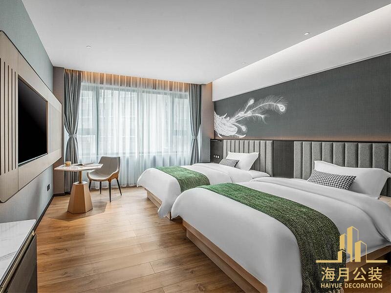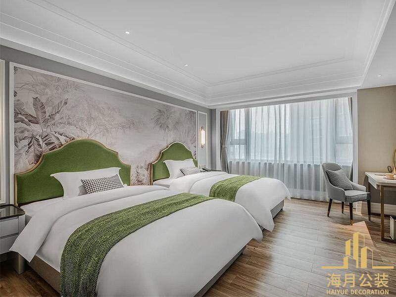 在客房设计中,深谙旅居者的核心需求,兼顾实用性与舒适度,大床房配置灵活,休闲椅,书桌与沙发榻的合理布局,实现了商务办公与休闲放松的双重需求,墙面艺术墙绘的点缀,更提升了空间格调;双床房采用对称设计,绿色弧形床头与植物纹理背景墙的搭配,或是简约灰调的延续,都在细节中彰显雅致。全屋原木色地板增强了空间温馨感,双层窗帘兼顾采光与隐私,这些细节设计,都是"以人为本"设计理念的体现,也是其团队专业实力的佐证。