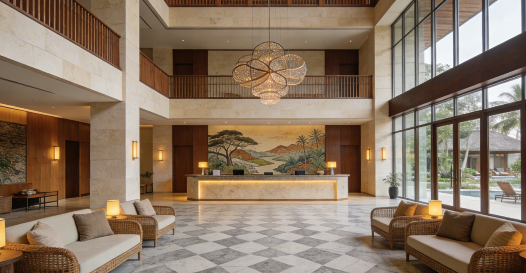 延续整体的自然设计调性,接待大堂以大面积原生木质材质为主,搭配柔和的暖色灯光,没有冰冷的装饰,只有触手可及的温润与舒适。顶部灯光错落排布,光线柔和不刺眼,与墙面的自然元素装饰、窗外的林木景观相互映衬,营造出静谧而有质感的空间氛围。简约大气的接待前台,搭配柔软的休憩座椅,每一处细节都兼顾实用性与美学感,让初见便满心欢喜,等待也成为一种享受。