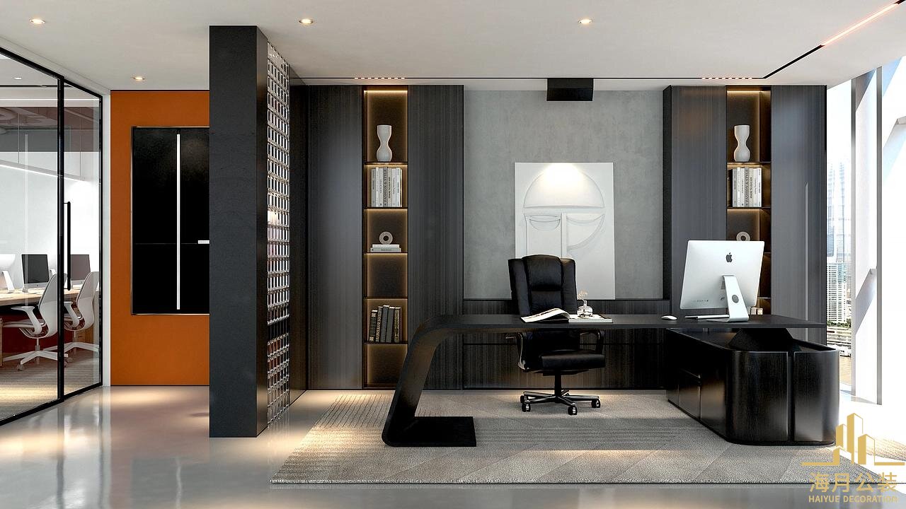 独立办公室采用深色系定制柜体+简约办公桌,搭配艺术装饰画与藏书格,营造沉稳专业的氛围;大面积玻璃隔断既保证空间私密性,又不阻断采光,让管理者在专注办公的同时,能随时感知团队的创意氛围。