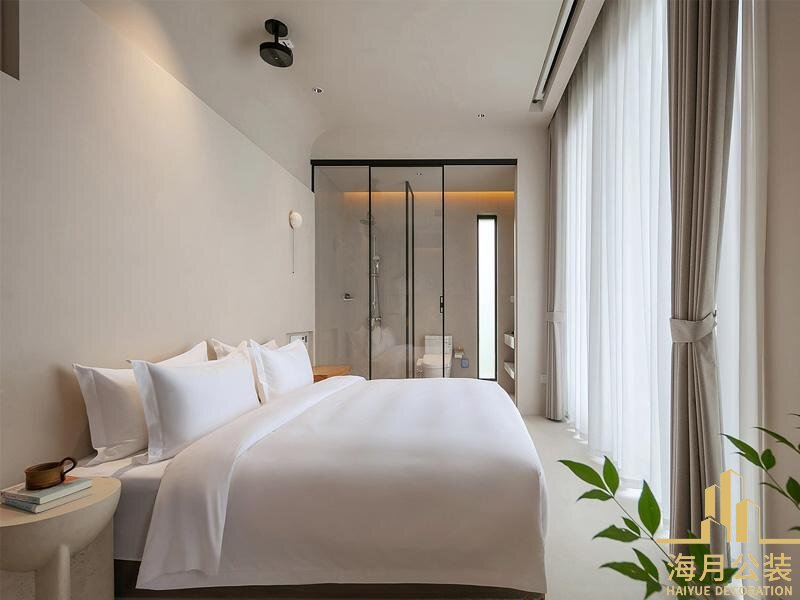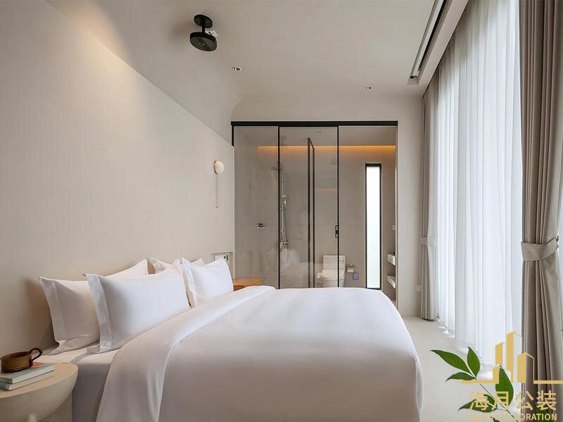 玻璃围合的卫浴区打破了空间边界,既保证通透采光,又让洗漱场景与卧室形成轻盈互动。这正是在极简民宿空间打造中的专业巧思,让功能与美学达成平衡。
