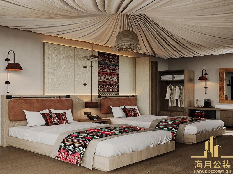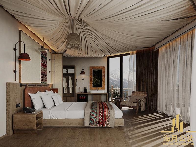 在空间规划中,我们以"居停-观山-沉浸"为动线逻辑,打造了各具功能的客房与公区,适配民宿设计的舒适居住与休闲体验。标间采用错落式布局,通过半通透的木质隔断保障隐私,同时让布慢吊顶的穹顶效果在视觉上连成一片;大床房则配备整面观景落地窗,四姑娘山的雪峰引入室内,住客晨起时便能与雪山云海相望。公区的树桩茶几,编织吊灯与手工挂毯,延续了客房的游牧美学,而隐藏式管线与智能温控系统的植入,又让野奢体验兼具现代舒适感,从布幔吊顶的张力校准,到图腾织物的精准定位,再到地暖系统的隐蔽铺设,施工团队以毫米级的精度,让设计图纸1:1还原为触手可及的栖息体验。