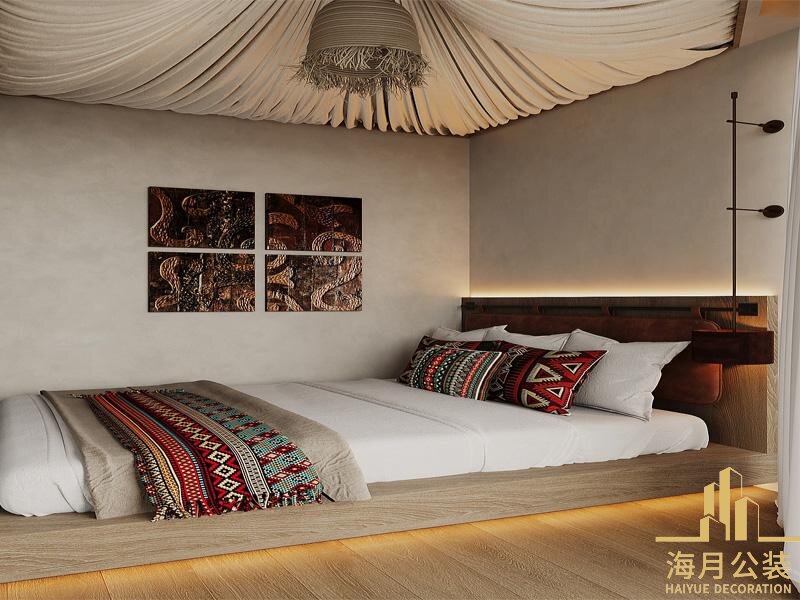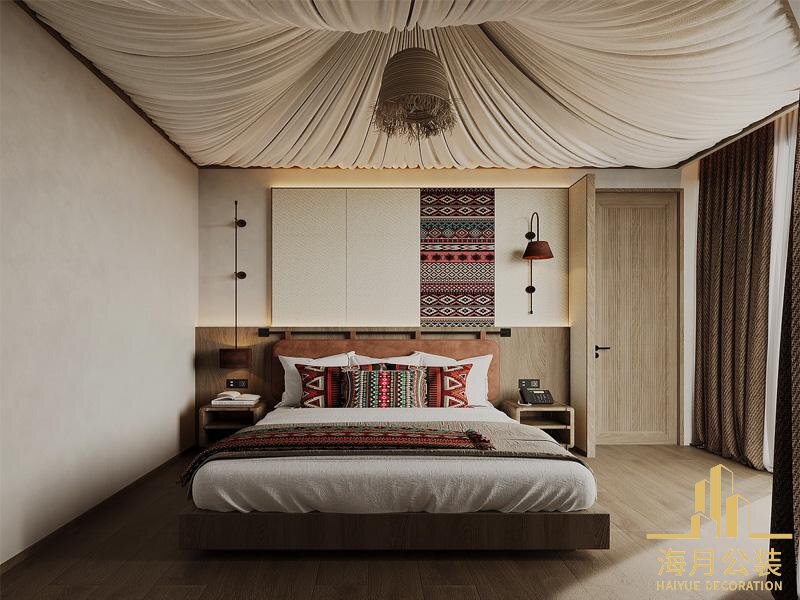 设计的灵感,源自川西高原上世代迁徙的游牧毡房。我们将游牧毡房标志性的穹顶结构,转化为软质米白色布幔吊顶,每一块布慢都经过精确的弧度计算,施工团队手工张拉成型,既保留了毡房的包裹感,又以轻盈的材质消解了传统穹顶的厚重。当阳光穿过布幔的褶皱漫进房间,整个空间便如同一座被温柔托起的"移动居所",让住客在躺卧时也能感受到游牧民族与天地共生的松弛感。