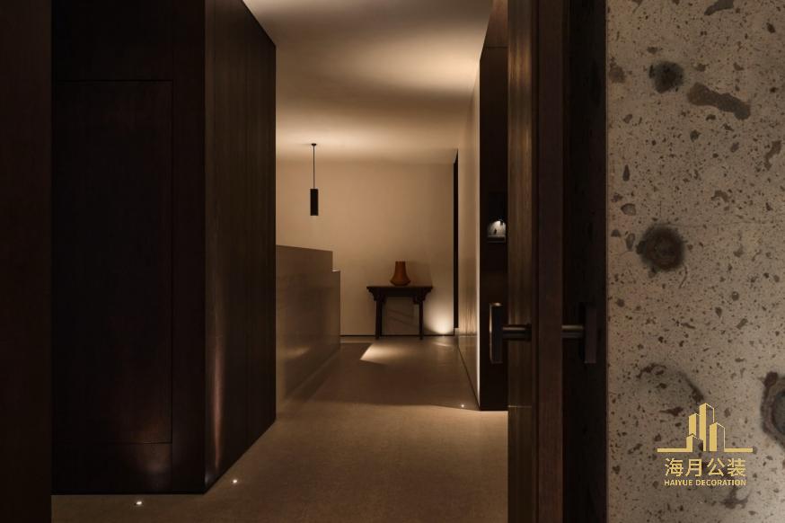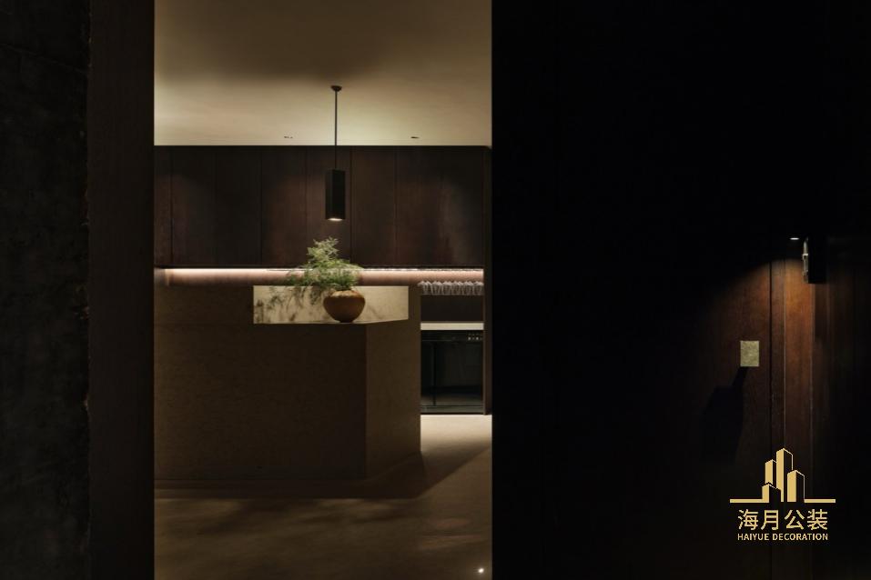 楼上是独⽴包间层,常规中餐厅多注重包间内的空间,外部⾛廊幽暗窄⼩。我们试图打破这种局限,减弱⾛廊的纵深感,避免空间压抑。装修设计以“客厅”为概念,从电梯厅出来布局了⼀个弹性空间,通过中轴⻔的开合,空间既可作为开放待客区,关闭起来⼜形成临时独⽴包间。电梯厅整⾯墙的精选⼤理⽯材延伸⾄⾛廊,营造空间的⽆限贯穿感,此外包间⻔把⼿沿⽤同款材料作为细节处的回应。