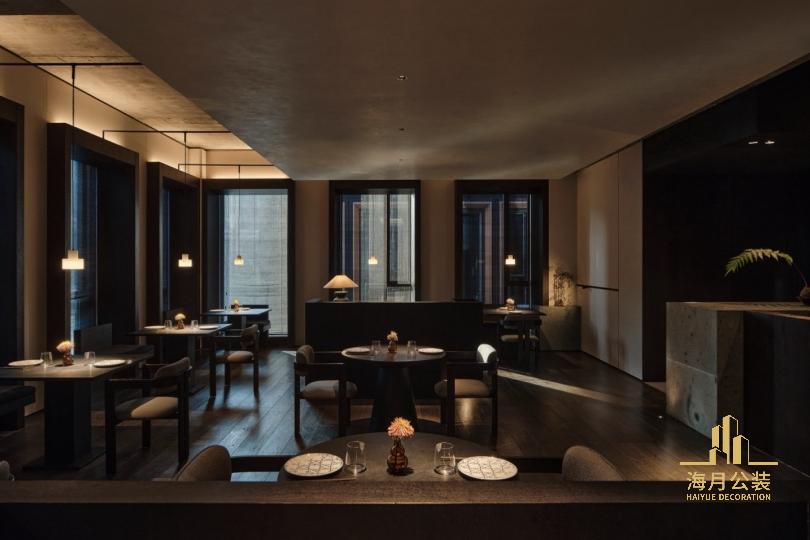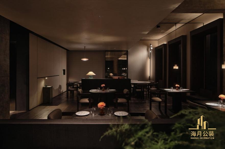 沿窗就餐区的桌椅摆放与每个窗框融为⼀体,窗框既是框景,⼜作为两⼈餐位。同时露出这⽚区的梁底天花,将所有管道⻛⼝等设备收纳于旁边的吊顶中,窗框⾼度与吊顶底部⻬平,两者之间的⾼差为吊灯的⾛线排布留下空间,并与天花脱开⼀定距离,远看灯线隐去,当落座于此⼜可以体验到⼀种⾼顶仪式感。在空间另⼀端的尽头,“锈迹斑驳”的镜⾯呼应空间整体材质调性,映照出对⾯的窗户,延伸强化了空间节奏。