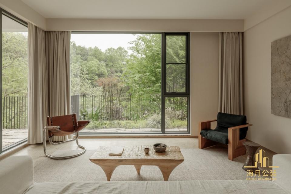 正对吧台咖啡操作区域,我们在装修设计中同样也设置了与操作台面等长的条桌,咖啡师在制作咖啡时可以同顾客进行日常的对话。16m的水平长条形窗创造了电影感的动态画面,自然和日常两种风景每天都在窗前交织浮现。地面铺陈着墨色天然石材,深邃、静谧;顶部是红雪松木,自室内缓缓延伸至外部的檐廊。通过材料与光线的巧妙组织,让人在空间中感受到流动的风景与时间的沉淀。空间的内外墙面,均覆以定制的灰泥。师傅手作批刮的痕迹-被保留,形成了粗糙而丰富的自然肌理。它们以一种谦逊的姿态,与周遭环境融为一体,为整个空间铺陈出朴素而静谧的底色。