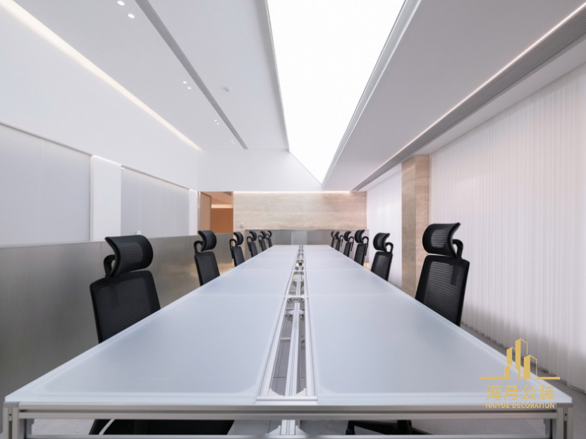 为了满足实际需求和为空间打造亮点,在入口部分采用45°的斜切,利用斜切墙面作为展示橱窗,缩短动线的同时激活平面,并与开放式办公区的倾斜发光灯膜相呼应。室内橱窗:入口一侧的斜墙面被利用成类似橱窗的空间,用于展示不同内容,根据潮流风向或节日主题来布置不同的内容。垂直方向上不封闭空间,在装修设计中抬高整体区域,利用半高柜划分办公与走廊区域;旨在使人们在空间中的移动更加灵活开放,期望空间中的人们也能更活跃起来。地台下设置灯带,强调边缘的同时为空间增加低位灯光,使整个空间弥漫均匀舒适的灯光。