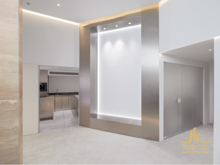 不划分工位,整面落地窗弱化室内外分隔,大片顶面灯光塑造均匀的光线,为主要办公区域塑造最舒适的环境;半高柜和磨砂玻璃保证内侧的二人办公室有良好的间接采光。灯膜向办公桌方向倾斜,隐藏了原空间中低矮的横梁并为办公区域提供均匀灯光。装修设计中采用工业材料不锈钢与自然材料洞石对撞作为主要材料为空间定调,为办公空间注入活力。入口走廊尽头展示墙左侧为茶水间,柜体全部采用不锈钢材质包覆,房间南侧向外开窗,使空间开敞明亮,为茶水间创造轻松愉悦的氛围。