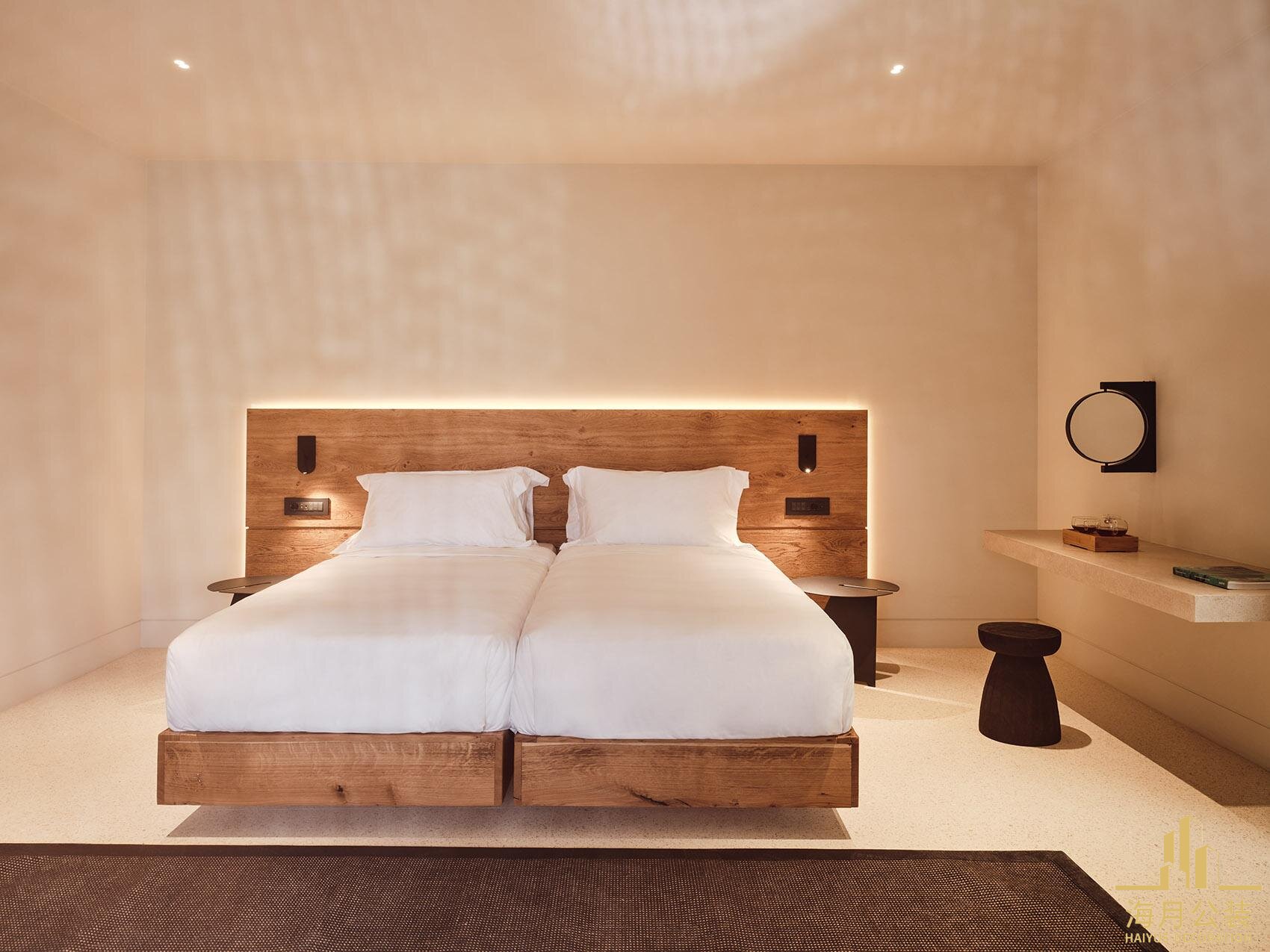大量采用金堂本地可寻的天然木材,如回收老房屋的木料打造床头板、置物架,保留质朴纹理与岁月痕迹,讲述本土故事;地面选用水泥水磨石,耐用且呈现独特颗粒质感,呼应金堂山水间的石滩、河床元素。同时,融入亚麻窗帘、棉麻抱枕等软装,增添自然触感,就像在客房中,木质床头搭配亚麻质地床品,水磨石地面延伸至阳台,与户外金堂山水景致自然衔接,让游客触摸到自然与人文交融的温度。