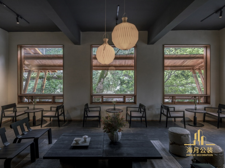 对于公共餐厅及民宿接待,南楼一层将四间教室的横墙适当打通,并在装修设计中进行结构加固,最大化的加强了这里的公共开放性,其中结合运营,公区餐厅亦设有自助式厨房,原有内侧支撑山体的岩廊结构暴露出来,作为自助厨房的背向,而将窗外的水平风景,作为身体的面向。