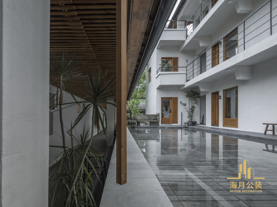 作为动线上节奏转化的重要节点之一,由客房围绕的庭院还得保证一定的隐私性:将两排楼之间的空地为核心,三栋建筑围合起来,塑造一个带有高差,环绕的庭院,通廊将不再孤立,而是庭院的一部分。新的改造在东侧结合高差打通了一个向上的台阶通道。如此,廊道不再是尽端而是可以被环绕。