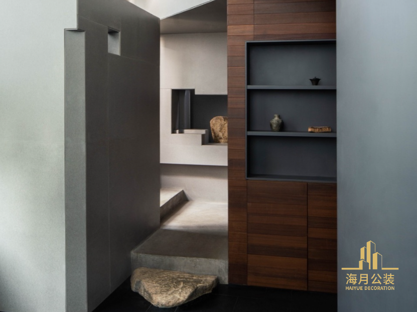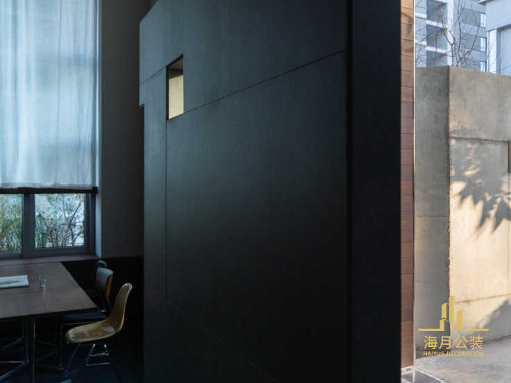入口部分设内外镜像双生结构,外有悬挑踏步、玄关半墙、钢板雨檐三项围合,内有雨檐、“L”折墙、台阶踏步对仗,引导台阶下行。内外半墙与二层楼板同高,可避入口人行视线,仅见墙内围景。为设定奥旷之意,欲扬先抑之法。
