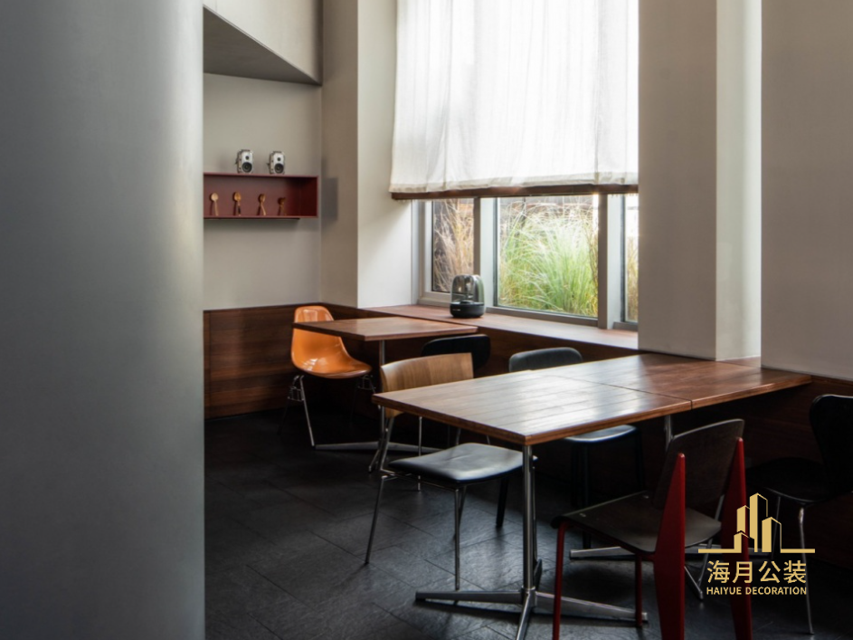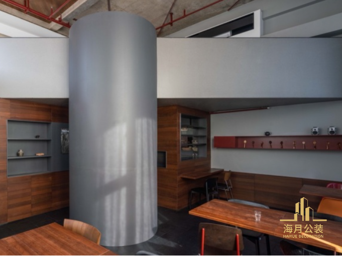 通二层旋梯,在空间设计中设在对角斜线的中点,也是整个方形场地的中心。高区正面闭合,面低区内向开口,外部铁灰,内部赤红,若平静外表下鲜活血肉般的生命激情。夹层为三角形,刚好一半的方形,设为展区。与挑空区有扶栏相隔,西、南两窗光线经棉布窗帘过滤、顶部波浪板反射,漫然内渗。三角夹层不定期陶艺、餐具、手工、绿色食品展览,北向有窗对住宅楼,未免双向互扰,有半透阳光板滤光隔视,沿窗设回收旧木长台以陈展品。餐厅的整个空间都笼罩在滤过的漫射光线中,深色地面的哑光、旧木涂抹过蜂蜡油的暖润、水泥板的清冷银灰、旋梯结构的红色油漆、横窗外的野莽草青,都显得温润质朴,彼此温柔。