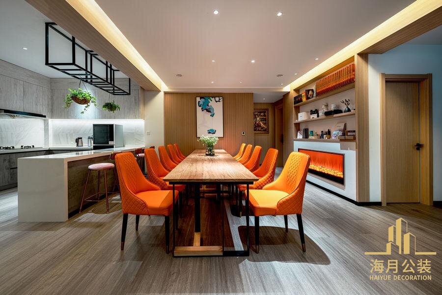 厅是味蕾与视觉的双重享受,长餐桌搭配活力橙色座椅,开放式厨房透着生活暖意。在这里,晨光中的早餐、暮色里的晚餐,都成为与自然共处的美好时刻。庭院另一角,遮阳伞下的桌椅静候闲坐,树木环绕形成天然屏障,隔绝尘世喧嚣。午后煮一壶茶,看光影流转;傍晚小酌闲谈,听晚风细语。