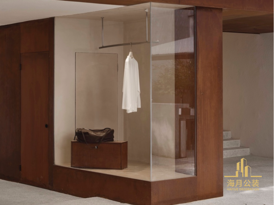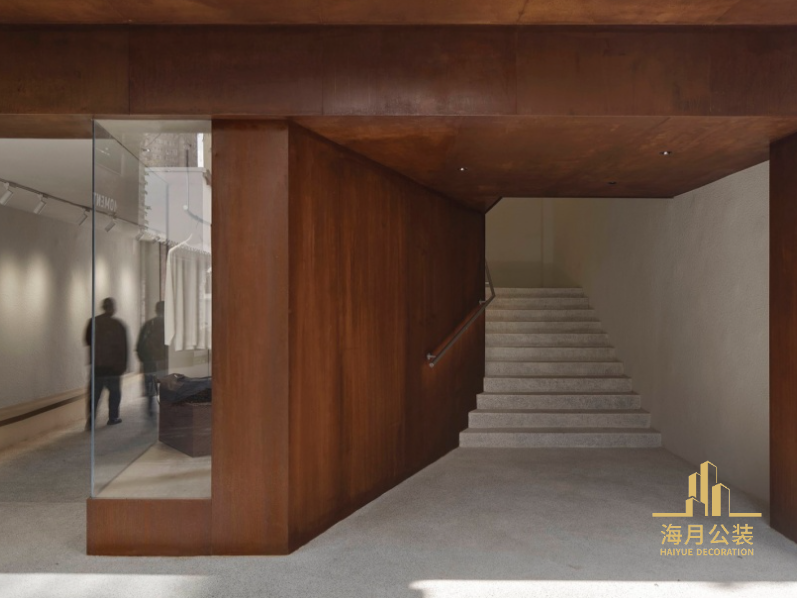 靠近入口一侧做了斜切偏转,使楼梯得以更多展示来引导顾客顺畅地前往二层,呈现出一种更加亲切、友好的商业姿态。在底层的大跨度洞口上方设置了一个水平延伸的长雨棚。除提供室外避雨功能外,它形成的阴影为体量之间的立面互动增添了一层朦胧而柔和的美感。两根角钢牵拉住雨棚的边缘,仿佛它们承担起主要的结构功能。耐候钢板带来的重力感与角钢的纤细形成了反直觉的对比,令雨棚似乎漂浮于空中,装修设计使整体显得既活泼又轻盈。