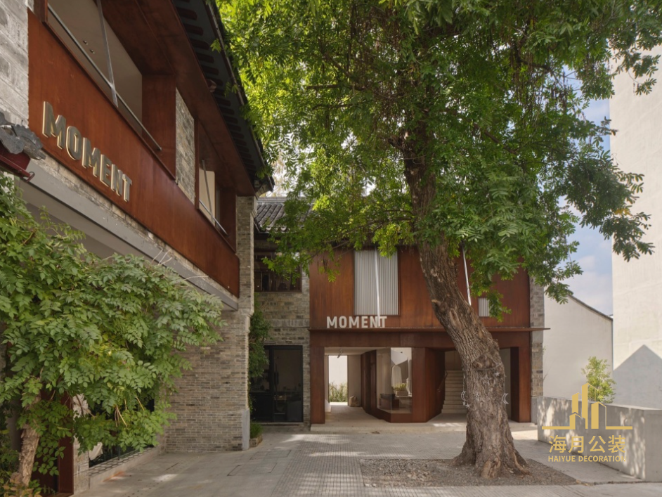 针对仿古建筑的商铺改造这一装修设计主题,需要为立面找寻到了一种既能保留老屋风貌,又能突出商铺品牌形象的介入方式。设计采用了一种类似欧洲古建筑修复与再利用的策略,通过现代化的窗框和开窗方式,为建筑带来新的生命与视野。窗构件材料选择了耐候钢,其表面的斑驳锈迹蕴含着一种时间感,与立面青砖的调性隐隐契合。同时,醒目的颜色和工业制品的平整度都与砖墙有所区分,能清晰地展现立面的新旧关系。二层正立面的窗洞维持在原有的位置,其尺寸被扩大成落地窗使室内更多地被看见。西南面山墙上的窗装饰有飞檐,通过钢板的织补将转角两侧的窗形成一个完整的、虚实相间的角窗。