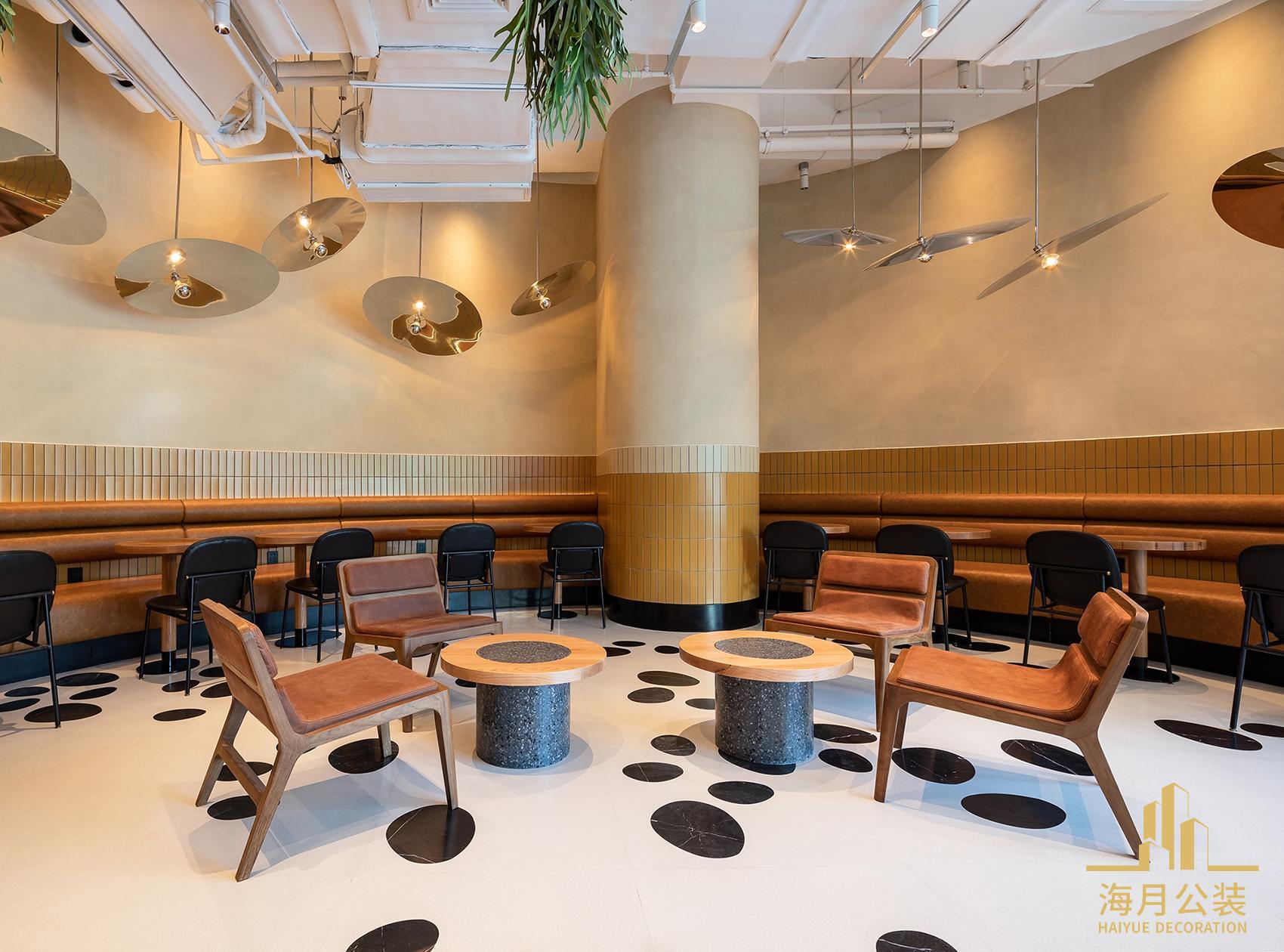 材质选择兼顾美观与实用。墙面采用涂料(米黄部分)与长条瓷砖(暖棕拼接区)组合,涂料营造柔和感,瓷砖易清洁、耐磨损,适配奶茶店高使用频率;地面地砖以白色为底,不规则黑色图案打破规整,兼具装饰性与耐磨性;家具材质多元,皮质卡座、休闲椅触感舒适,提升坐感体验,木质茶几温润自然,石材吧台、桌面则以坚固耐用与独特纹理,成为空间“质感担当”。不同材质在视觉、触觉上相互碰撞,构建丰富体验层次,让顾客从踏入空间起,就通过材质感知到品牌对品质的把控。