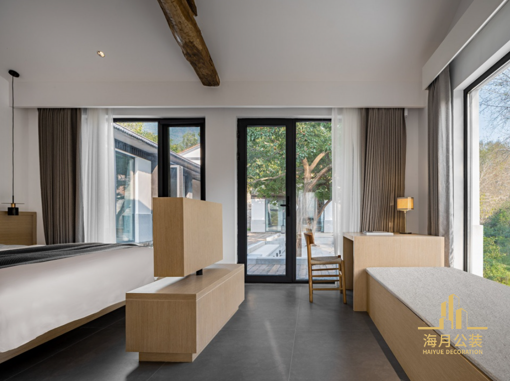 室内装修设计延续了山居小院舒适温暖的格调。我们保留了朴实的色彩基调,和建筑原有的木梁架结构,同时,还有那抹清丽的气质与慵懒的氛围。