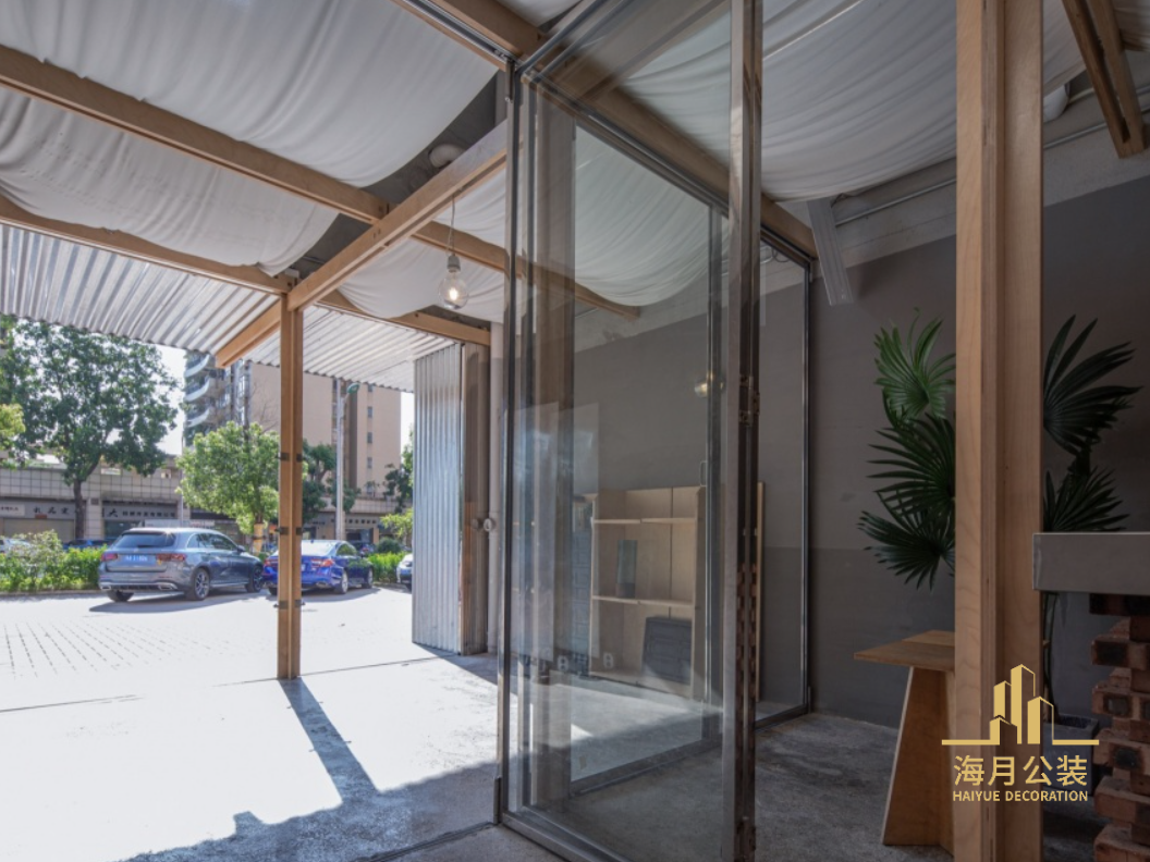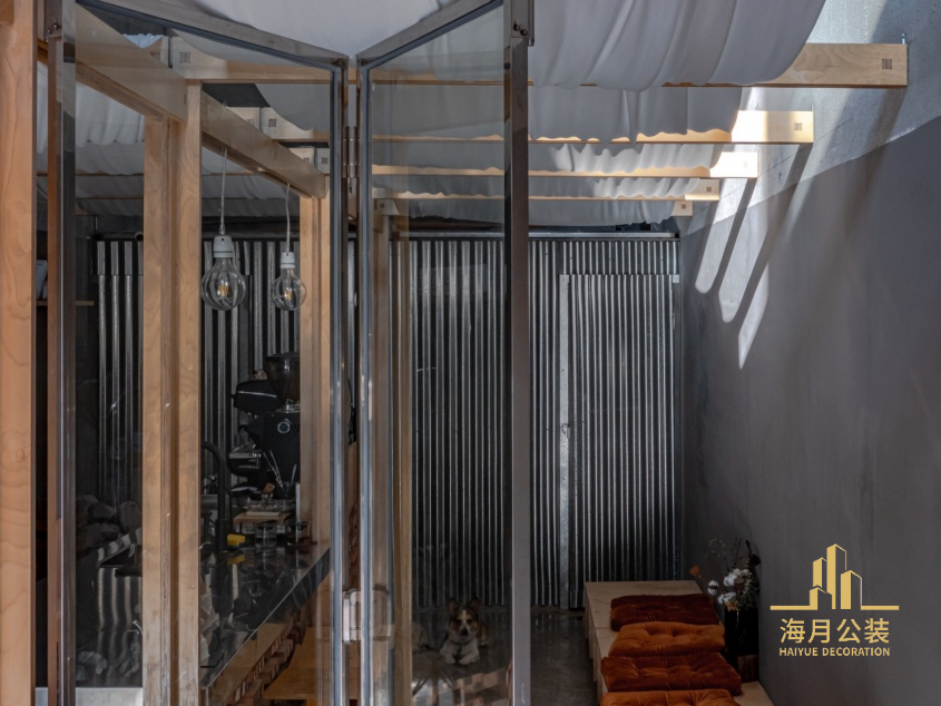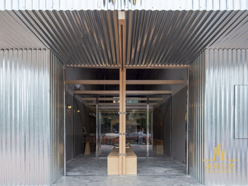 清淡的木色与轻柔悬挂的连续布幔,为社区人们的停留提供温和的体验,同时由于木构架以上的空间被布幔遮挡,适当地减少了建造面积,有效控制造价;入口处在装修设计中考虑内退了约1/3的深度,形成一个半户外遮阴区域,供人们在天气炎热或有雨的季节在室外活动;最外侧的围蔽保留了包租公的不锈钢拉闸门,这种门在珠三角很常见,让新店带着些自然的熟悉感;内部入口的折叠门则可以在天气舒适的时候完全打开,通过木构架的延续性模糊了室内外的边界感,我们希望这种有趣的围蔽切换能给这个空间带来其他的可能。