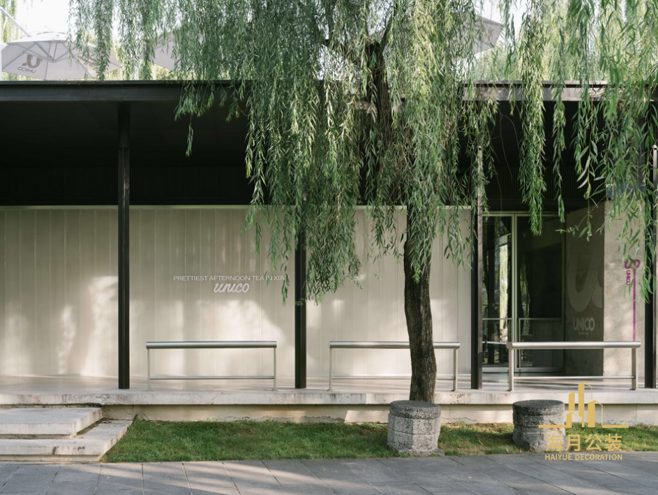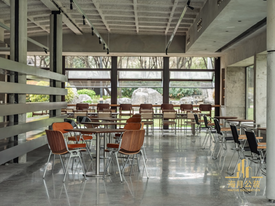 基于“轻改造、弱介入”的改造原则,装修设计保留了原本钢构与玻璃组成的建筑框架。项目基地与公园橡胶跑道仅有数米之隔,时常有晨跑运动的人们来往经过,意味着比邻跑道的建筑立面,有着很强的互动基因。在这个界面,我们选择混凝土浇筑的方式做了局部围挡,混凝土片墙的上部做了手凿处理,产生肌理的变化。之所以选择混凝土,是因为项目周边存在着大量具有年代感的石柱础、拴马桩,不远处的白石桥亦呈现在眼前,我们希望改造后的建筑能够融入这个绿意盎然又历史悠久的遗址公园中,没有显性色彩和质地的混凝土再合适不过。