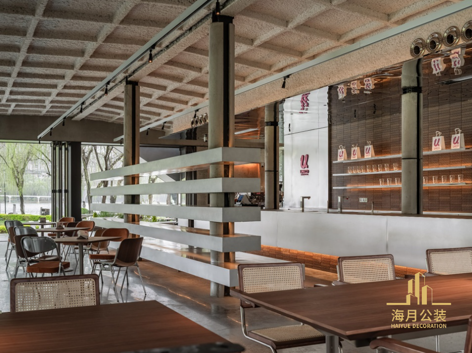 延伸的屋檐对原有树木做出避让,我们希望保留装修设计的善意,在这个公园中,建筑不再单纯地突出自我,甚至连一棵树的生长都不应被打扰。建筑可以在形态和功能上做出调整,但它始终应与自然保持一种和谐的共生关系。室内部分,依循建筑改造的脉络进行空间重塑,遮挡的界面对于空间功能划分起到指引,设计将操作台和卫生间置于遮挡面之后,而基于建筑空间的通透性,空间的设计只需释放窗外景色,使顾客在不同的用餐区域都有可远眺的景色。