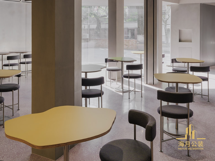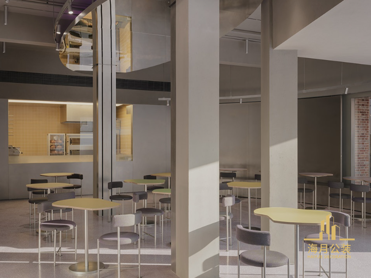 从踏入进空间的第⼀刻,踩在脚下的淡淡紫灰色就为每⼀位到访者创造着轻松的氛围。空间用色与基调的思考源于我们如何构建这个时髦又古怪的男孩形象,基于创始人也基于每⼀位家庭成员。包裹着用餐区的不锈钢表皮拥抱着整个装修设计成为主要基调,淡紫色的水磨石地面统一着半独立的咖啡空间和主用餐区,配色各异的异型桌椅为空间带来独特的用餐体验,依照空间秩序排布的照明默默的成为氛围配角,材质和配色在空间中各司其职,平衡协调着空间氛围。