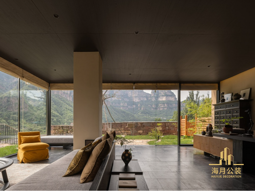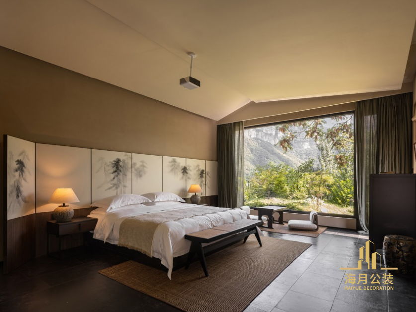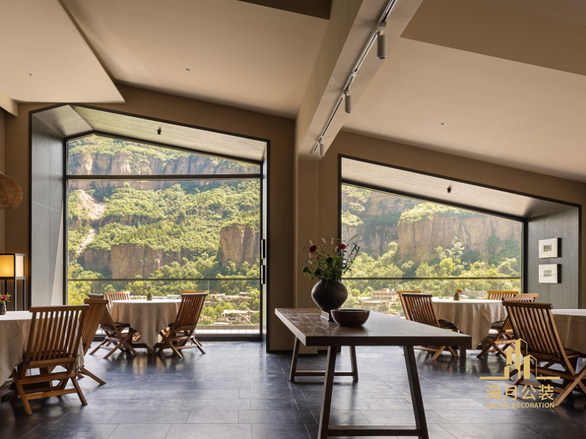 餐厅取作“入云坪”,两面落地玻璃可以近距离感受太行扑面而来的气势,我们没有用隔断分开吧台和就餐区,让视野和动线都是自由方便的。客房的装修设计理念延续“回归自然质朴”,以家具、以尺度,以细节完成一场纯粹的安静。家具,是空间情绪的表达。根据酒店气质定制的软装家具,温润厚重;柔软的窗帘有自然的褶皱,微透的光给空间增添一份朦胧,不做过多的装饰,希望可以让自然包裹你,让自然治愈你。夏日听蝉鸣鸟叫,躲进自在的山野避暑,冬日围炉而坐,看窗外大雪纷飞的浪漫。这里离城市很远,离自然、离内心很近。檐廊听雨,品茶闻香,以诗意的美学享受度假生活。