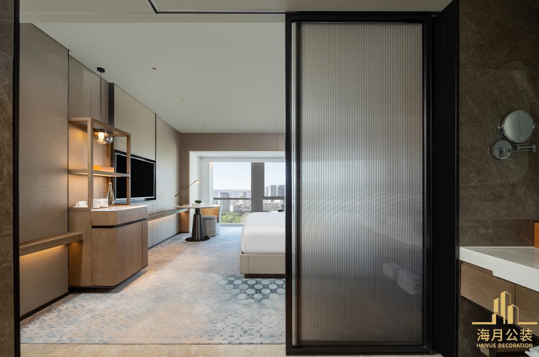 客房作为住客休憩的核心区域,工装设计聚焦于空间的利用与居住的舒适性。整体设计简洁大方,摒弃了冗余的装饰,采用柔和的色调,如米白、浅棕等,营造出温馨放松的休憩氛围。床品选用顶级材质,触感柔软丝滑,搭配质感良好的实木家具,每一处细节都彰显着品质。客房内的设施布局合理,兼顾了实用性与美观性,工作区、休憩区、卫浴区划分清晰又相互关联。玻璃隔断的设计是一大亮点,它既增强了空间的通透感与现代感,又能在必要时保证区域的私密性,让住客在客房内也能感受到开阔的空间体验,仿佛将成都的开阔天空与闲适生活搬进了室内。