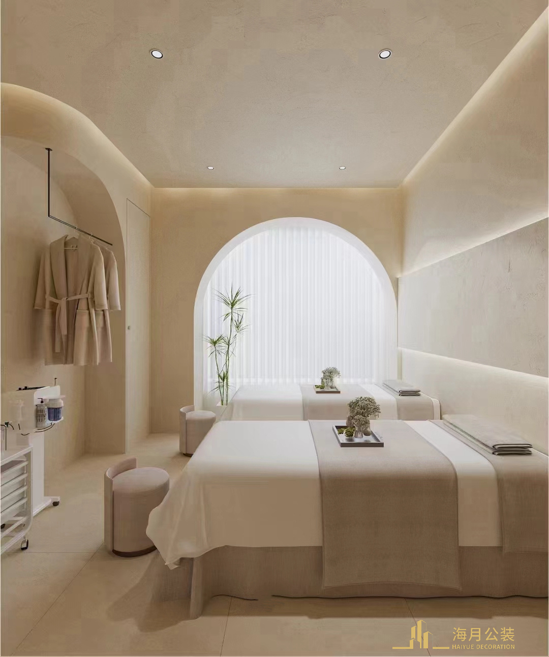 美容室内延续整体风格,配备符合人体工学的浅色护理床,帘幔轻柔区隔空间。每个细节都体现着对顾客的关怀:恒温储物柜、静音新风系统、以及专属的私人用品保管盒。