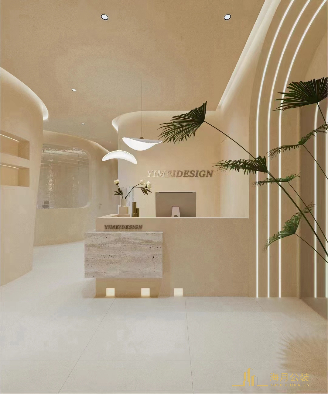墙面采用微水泥与艺术涂料的结合,打造出柔和颗粒质感,搭配弧形线条与拱形元素,弱化空间棱角,营造安心舒适感。定制柜体与接待台均采用圆润边角设计,以低饱和度色彩呈现温柔视觉体验。