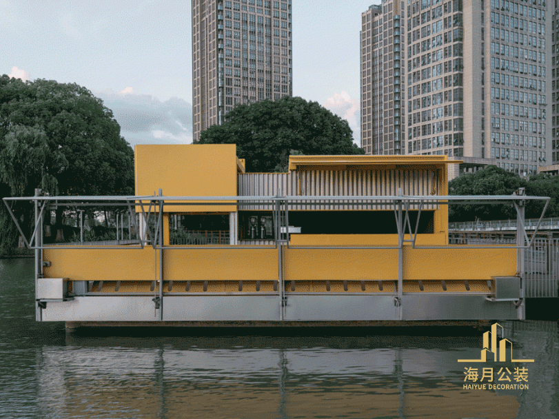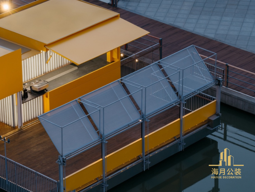 为了尽量减少对原有平台的干扰,项目采用轻钢结构体系外覆铝板,地面铺设竹木材料。主体结构为不可拆卸的整体固定式构造,以确保长期的稳定性与耐久性;与此同时,外立面可开合、可调整的界面系统使其能够在不同的运营场景、季节变化及光照条件下呈现多样化状态。这种“稳固的骨架 + 可变的表皮”的建构策略,不仅延长了建筑的生命周期,也通过装修设计赋予其在城市环境中持续适应与回应的能力。我们希望它不仅是一个功能空间,更是一种可以被持续使用、不断激活的空间框架。
