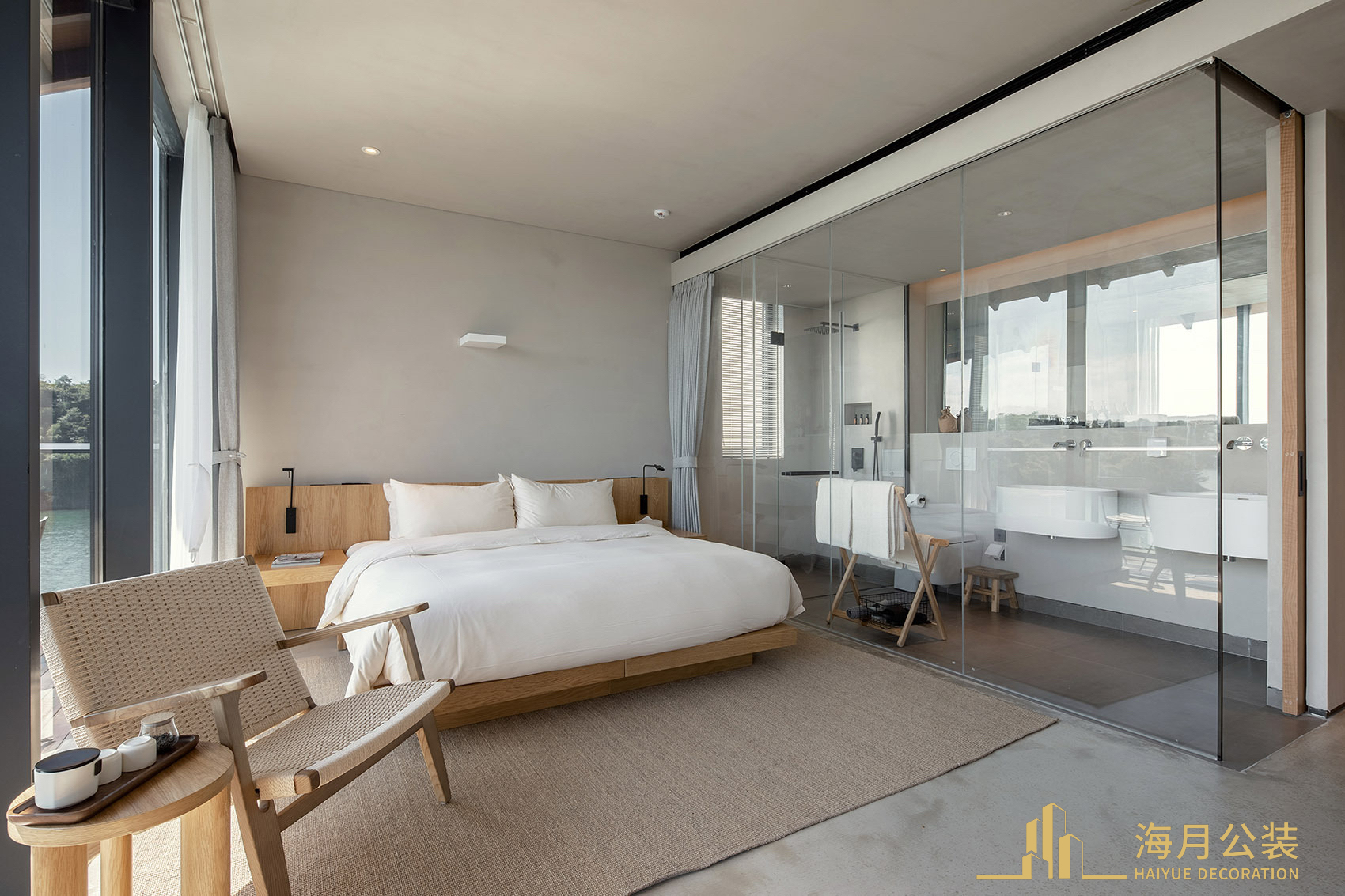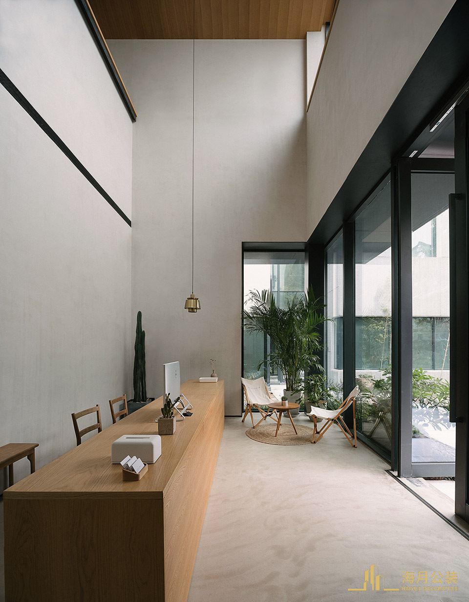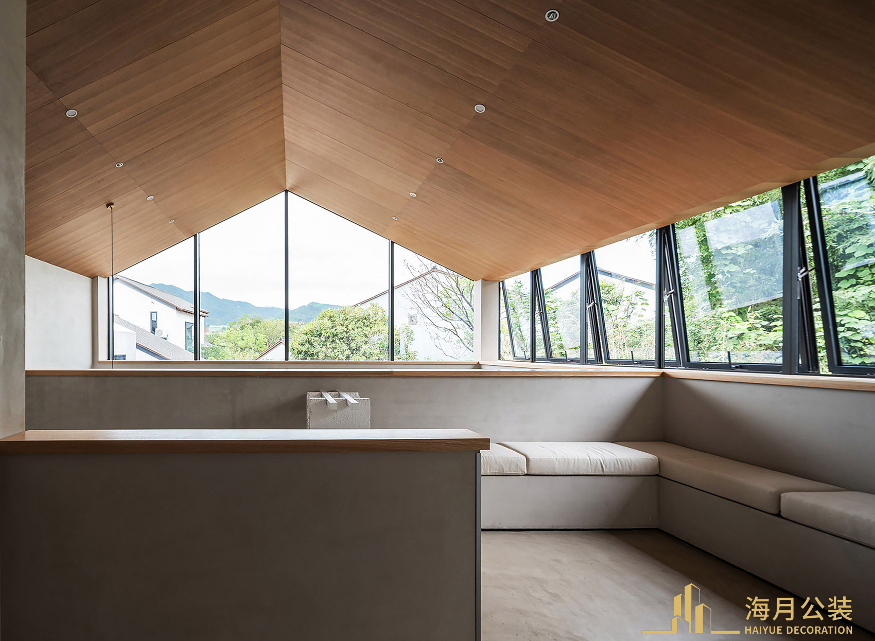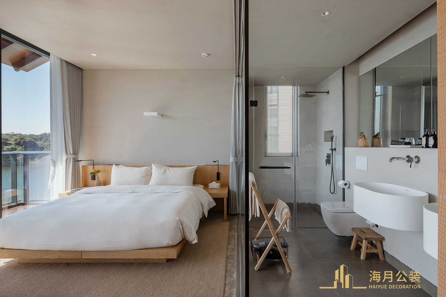 在形式操作的层面,以装饰性的手段将所有建筑工业化的表达抹去,没有结构的暴露,也尽可能隐藏了机电的痕迹,平整的天地墙将空间的高潮引向窗外的自然本身。在材料操作的层面,用质朴的黑白灰色调与木材回应原始村落的记忆。不过分强调设计感也不刻意回避当代性,一切以和谐的氛围为主旨。在器物选择的层面,恰当合用是判断的标准。在最大限度精简的前提下,满足功能使用上的舒适。在执行这些操作的过程中,外部环境自然而然地成为了整个空间体验不可割裂的组成部分,而这种存在形式也恰好构成了对在地性的回应——剥去窗外的千岛湖,空间就不是完整的;而不同状态的外部环境又反过来赋予了同一空间几乎完全不同的性格。最终通过这一系列主动规避的过于主体性与竞争性的设计操作,空间与自然达成了礼貌的沟通与互相渗透的平衡。