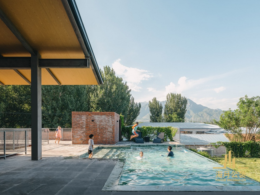 院门和院墙在地势低洼的村道上看起来高耸如城堡,而踏进院门,穿过砖井投下的光影,却如孩童钻入光怪陆离的兔子洞,来到一方小小的新天地。下沉庭院被休闲娱乐厅、厨房等相关配套设施包裹围合,六根方整的立柱撑起天井庭院,孩子们轻快的脚步声咚咚地在头顶响起。庭院的尽头,细碎的光点在草茎的弯曲回弹间明灭不定。