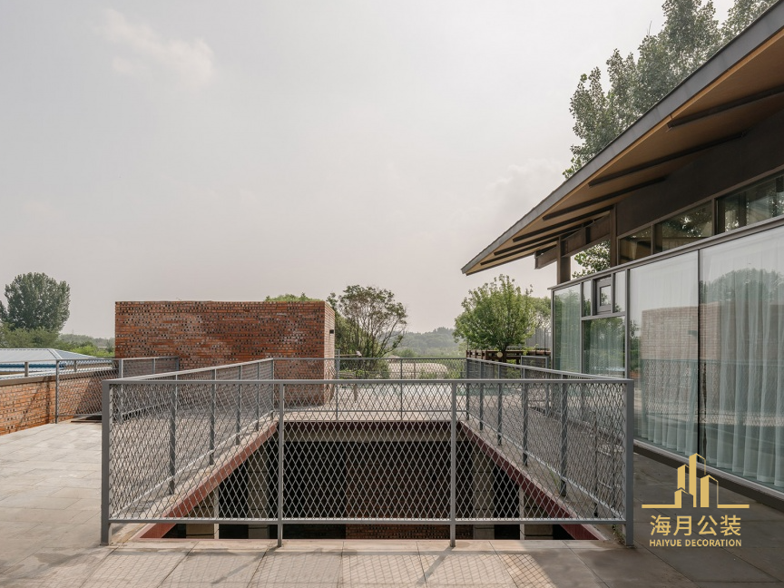 从下沉庭院拾级而上,地势回到场地本身的标高后,带来的是远处开阔的视野,山峦、树梢、田野连成一片。收回视线,是院子里石板平台、茸茸草坪和柔软水面。原有的两栋房屋质量尚好,因而得以顺利保留。北侧房屋的屋顶之上额外架一层巨大的单侧钢质屋顶,在远处村庄的边缘也能一眼瞧见,乡野民居的平淡通过夸张体量得以平衡。大屋顶下通过空间设计我们置入玻璃盒子作为多功能厅,使钢质屋顶轻盈地漂浮在房子之上。再给原房屋复合公共休闲与交通功能,红砖堆叠中回归村土寻常。