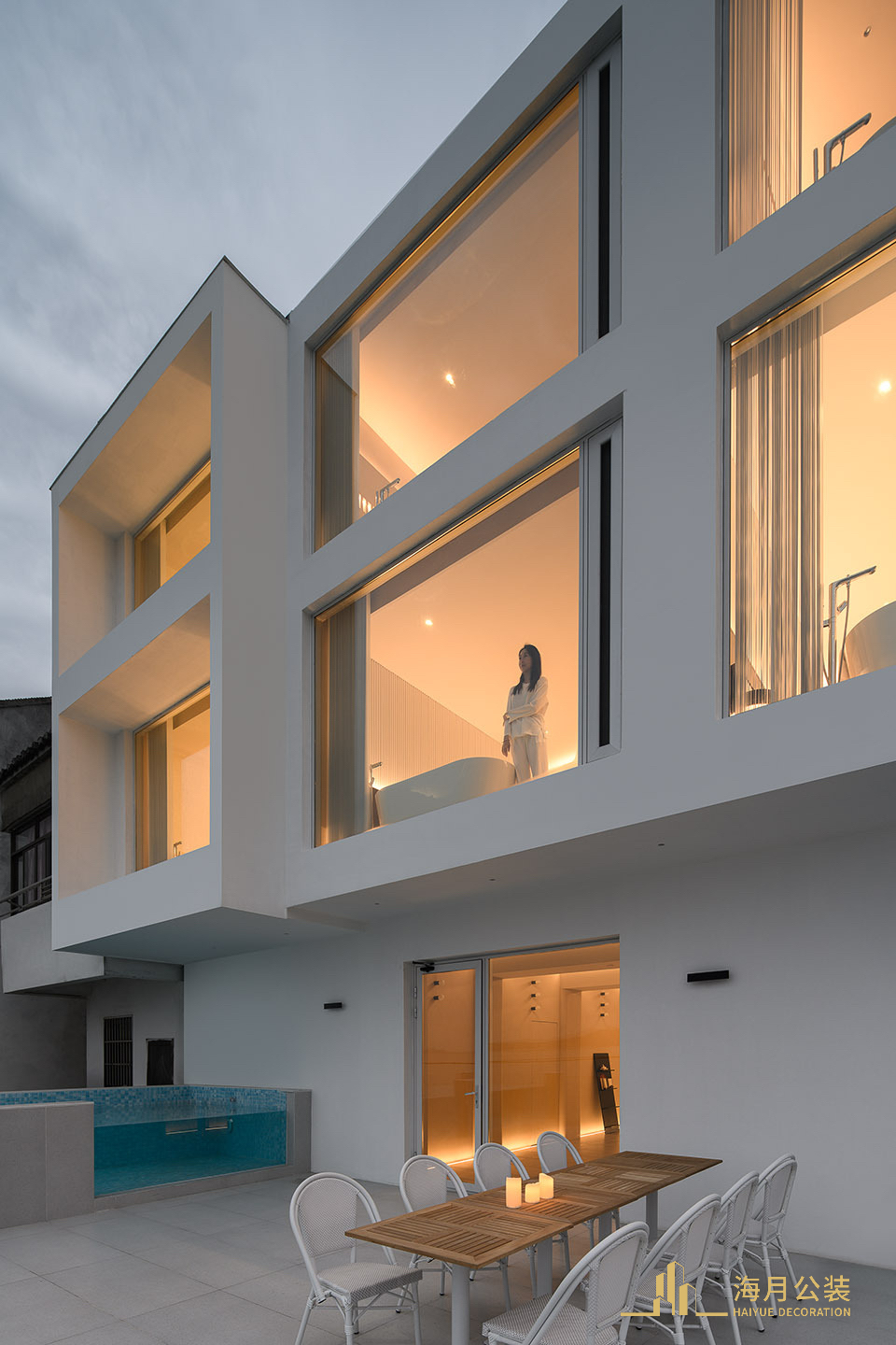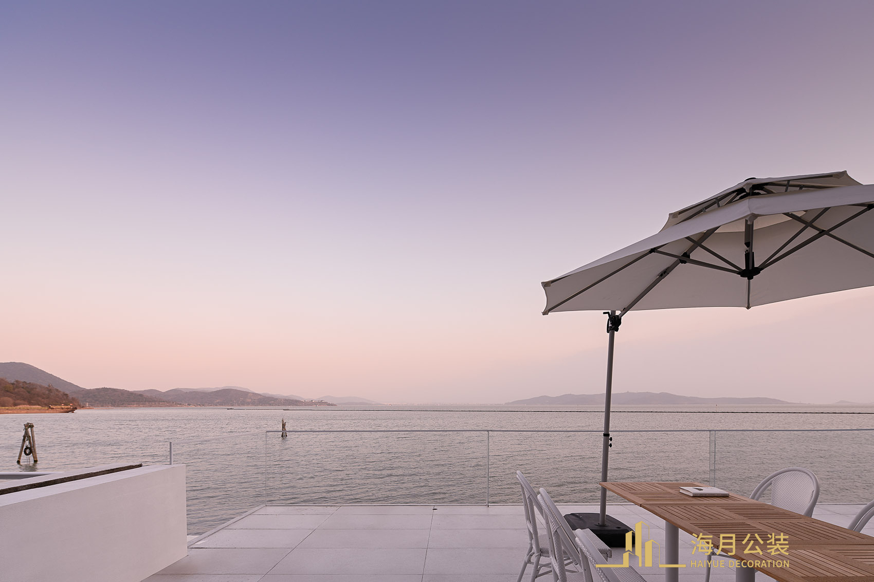 近年来,为了减缓捕捞对生态环境造成的破坏,太湖开始实行“十年禁捕”计划。面对十年禁渔的太湖,曾经以捕鱼为生的渔民纷纷驾船回港,停靠在港边的渔船连成一片,在安宁中又显露出一种繁盛的状态。我们的民宿项目便坐落在太湖边,这片渔船之中。项目原建筑是太湖边的一所民房,房东以前便是靠打鱼为生的渔民。我们期望在新的项目改造之中,能够将他曾经“沧波万顷即良田,一舸东西卧碧天”的美好记忆保留在建筑里,由此便展开了以“渔船回港”为核心的空间设计。原建筑为当地村民自建粉色欧式小洋楼,因乡村建设控制不能对建筑进行大改大建,只能对外立面进行限制性改造。我们采用“微创手术“的方式尽量用最小的介入方式,让建筑能够达到比较好的状态。首先是把所有罗马柱及欧式的符号拆除,换掉绿色瓦片,粉刷外立面,去掉边边角角,让建筑还原到最简单的状态。室内尽量扩大景观面我们再窗边设计了一个很小透气窗。增加每个阳台的包围感。通过小拆小改让建筑更新。轻盈的纸船漂浮在建筑的入口处,拉开了空间的序幕。此处是回港渔民暂时停泊的港湾。空间中随处可见渔民生活中的物件,打捞的贝壳、渔船的造型、水的表现形态……它们以元素的形式介入空间,以“渔船回港”为核心,将一楼空间打造成对外开放的停泊、休憩的咖啡厅,同时也可以作为民宿的公共区域。空间中加入“船”的元素 —— 建筑与室内的大面积留白。作为视觉的重心,咖啡吧以抽象的船只形象出现,停泊在空间中。梁柱是船只的桅杆,以卡座、靠板为船体。将社交功能与艺术美学带入空间设计中,保留了咖啡厅的商业化功能,同时在意象化的演绎中解构时间,将咖啡厅打造成漂泊于湖面的渔船,营造出渔民日常的生活氛围感。空间里承载着渔民过往的生活碎片,太湖水底的石子铺设在楼梯底部,为空间注入了另一重含义。简朴的陈设与光线交叠。通往上层的楼梯,以老旧与新式结合的形式呈现,保留了部分原建筑的造型,古旧的檩木、椽子露出时光流淌过的印记,与极具现代感的楼梯造型结合,塑造出视觉感官的新旧对话。