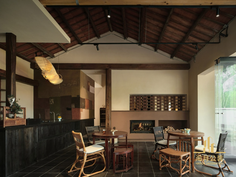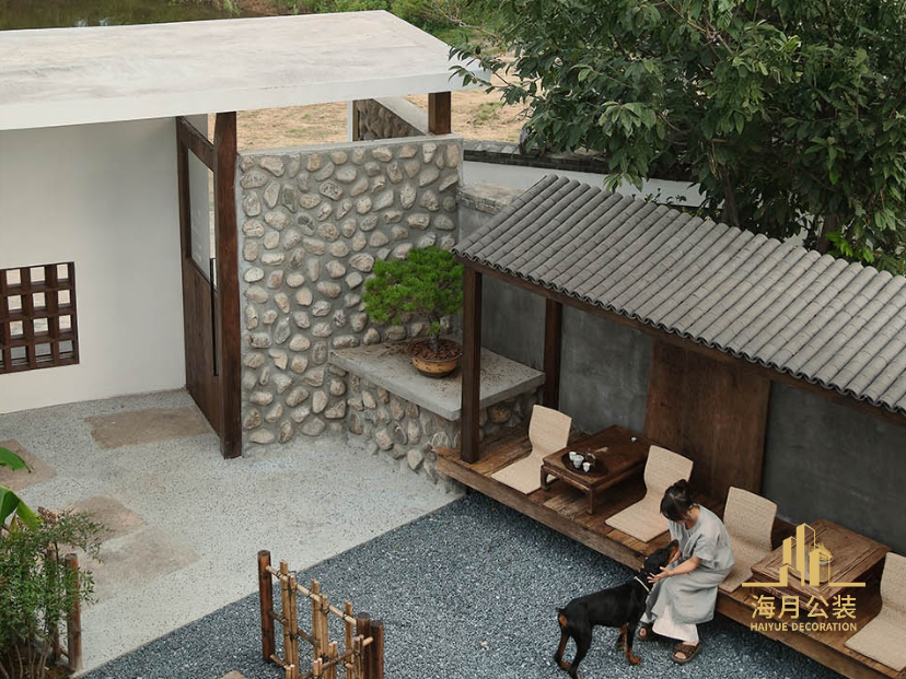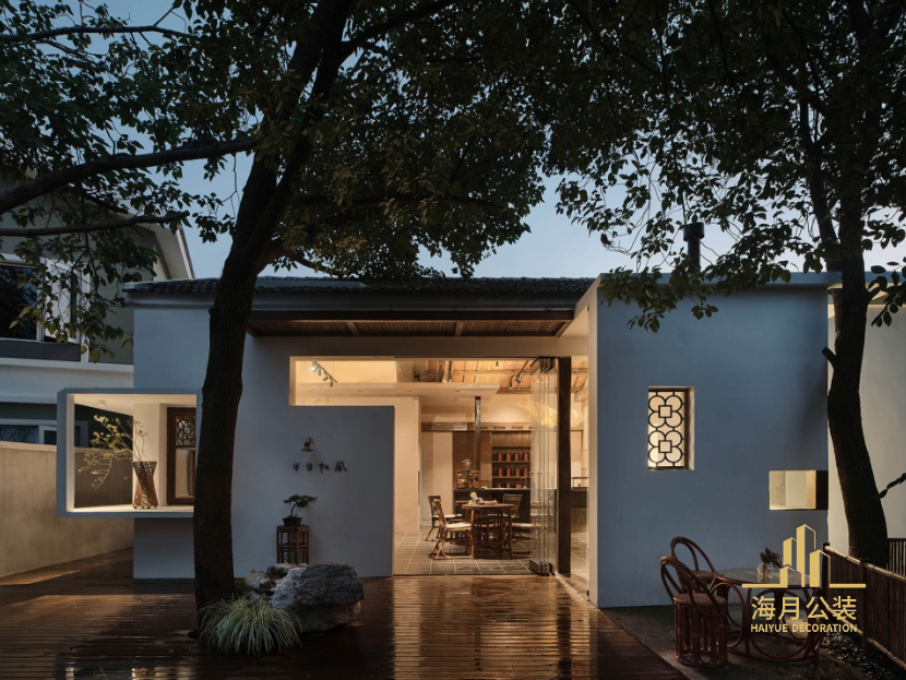 整个院落的装修设计以中心区域的建筑群大致切分为四个单元:前院、侧院、后院和最北端的竹林。不同的院落,游园的重点各不相同。但他们串联在一起,是一段完整的由喧嚣走向宁静的叙事过程。前院山门内外入口错开,形成入门遮蔽转角。进门左侧为喝茶凉亭,它与山门连成一高一低的节奏;右侧置入松石水景,将天光水光一并纳入。