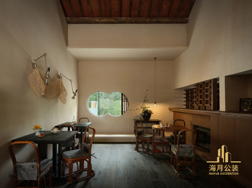 通道东侧另设一条小径通往一旁的小茶室,小径入口处以两丛竹子留出宽不足米的间距,营造茶室的半遮敝性。中间墙体以局部镂空窑砖打开,又袒白了这条复廊的存在。茶馆位于建筑北隅,其形制为坡顶双开间之格局。装修设计中几处窗景以深檐口温柔包裹,既过滤掉室外强光,也确保了窗户外展的安全性。洞口内侧嵌入花格窗棂,成为捕获窗外景物的多变界面。坐于室内,光影斑驳。当人与外界进行生动的互动体验之时,才能让人理解并确信,内在的诗意营造可以超越物理的边界。