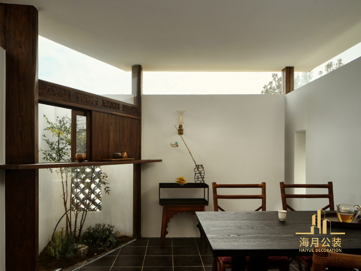 园林的灵魂在于它是按照人的意愿,庇护最大限度的宁静。我们装修设计在这个咫尺方圆内,将自然缩小到适宜人体的尺度,它便成为抵御现代生活侵蚀的庇护所,从而与那些寻求与自然相连接的人们共通。前院至建筑的一侧由植被坡地蜿蜒成两条路径,一条通往工作区,另一条连接侧院直通后院的茶馆。我们将侧院入口的建筑立面打开,把原本位于室内的区域置于室外,使它成为连接两个院落的通道,引导呼吸与停留。