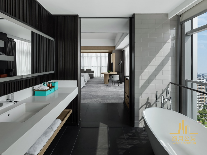 简洁的线条和清晰的体块构筑了客房空间。房间的装修设计通过简明的材料糅合当代设计和传统细节,辅以低饱和度的颜色,营造出宁静、舒适的氛围。