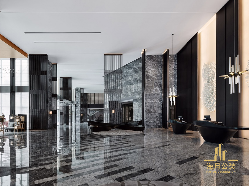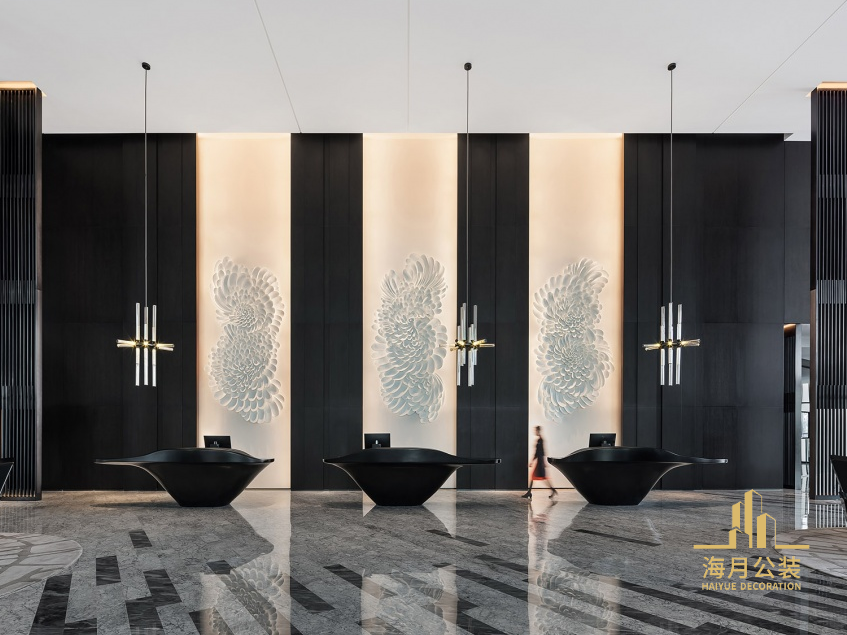 挑高的大堂以深木色为主调,屏风层层叠进,带有庄严的阵列感,稳重而雅致。入口与尽端的亚克力山朦胧迷幻,似雨后忽远忽近的山峰。地面水纹石材顺着海的方向延续到墙面,将中山平原广布、丘陵点缀、河网密集的地貌微缩到大堂室内。接待台以山之倒影为原型进行空间设计,一改传统,呈分散式排布,轻盈的立于灰色石材之上,灵动有趣,消解纵深空间。玻璃钢材质的中山市花菊花花瓣被拆解重组,结合鹦鹉螺的螺旋造型,构建出各异的形态,使接待区的背景呈现出多样性。