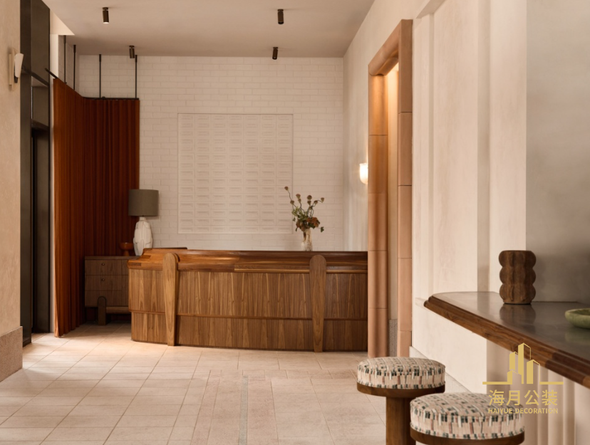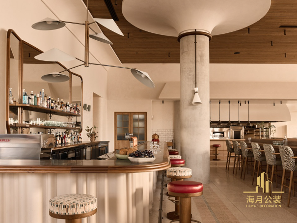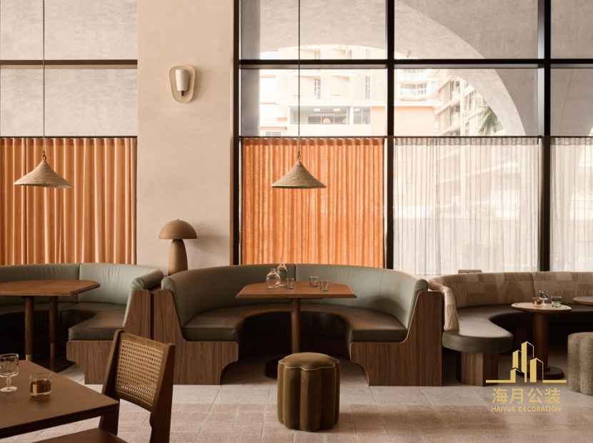 场地装修设计中最大的挑战在于如何同时应对不同客群的动线需求。它既要服务早餐、午餐与晚餐三类不同的餐饮时段,又要满足社区客群对外带咖啡的期待,同时还承担酒店接待入口的角色。团队在设计中必须兼顾运营的前后台流线,确保高效顺畅。我们的装修设计回应,旨在既满足多样化的客流组织,又在高容量空间中创造亲密的用餐体验。树状柱的引入不仅支撑了5米高的天花,也为场地注入了中世纪现代主义的语言。开放式厨房上方覆盖的威尼斯灰泥拱廊,让形体与空间的互动更具张力,而20世纪风格的家具则在高耸的建筑背景中稳住尺度,营造出一处充满活力的滨水沙龙。鉴于滨海的地理位置,材料必须能经受海风侵蚀、沙粒带入,甚至顾客湿身而来的使用条件,同时又不能牺牲手工感与丰富的材质表现。