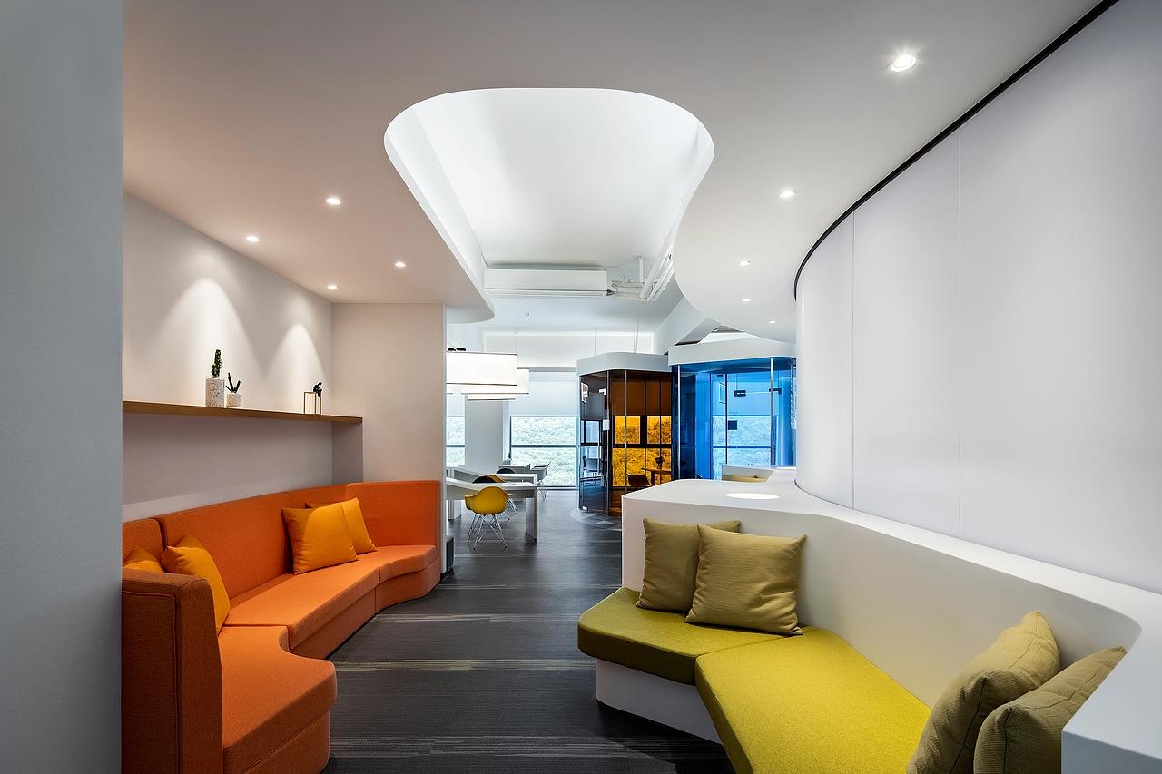 色彩搭配遵循“基础色调+亮色点缀”的原则。以白色、灰色为空间底色,营造出冷静、专注的创作氛围;同时,通过橙色、黄色、蓝色等亮色进行“点睛”,既打破了单调感,又为新媒体行业的活力属性做了视觉注解--这些色彩如同创意的“火花”,在简约基调中点燃空间的活力,契合新媒体行业追求创新、敢于突破的品牌气质。